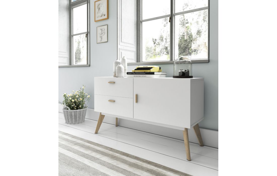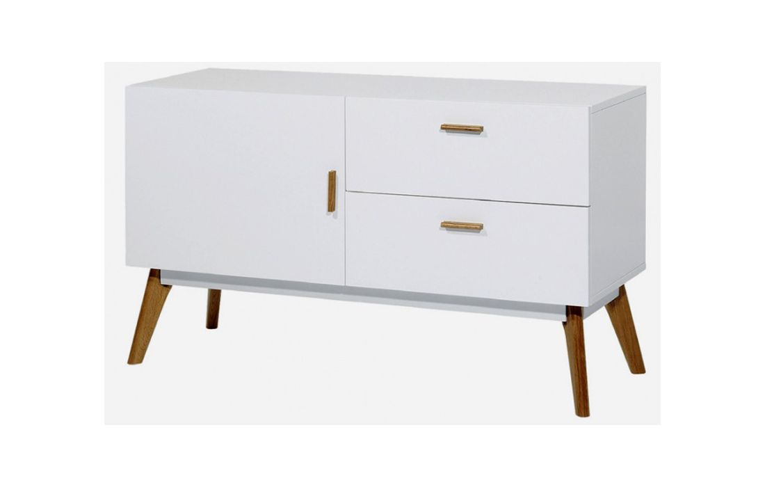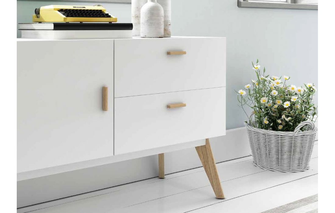 Aparador em lacado branco com pés e puxadores em carvalho.