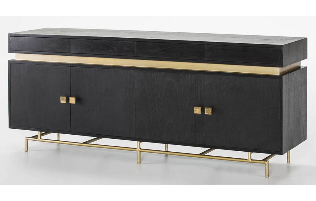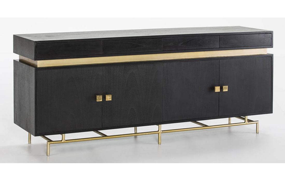 Aparador com 4 portas e 4 gavetas em madeira de cor preta e base em metal.