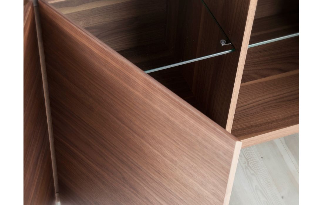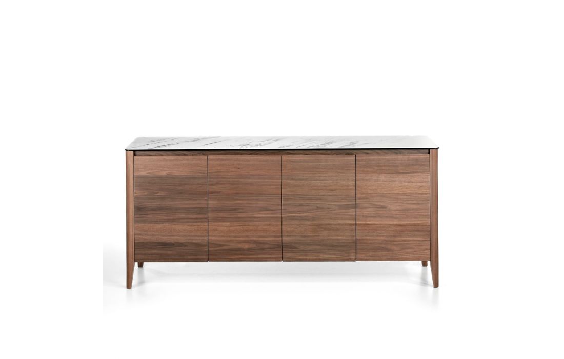 Aparador moderno com estrutura em MDF de nogueira natural, pés em MDF de nogueira e tampo de vidro com efeito mármore em porcelana branca e veios cinzentos em acabamento brilhante, com um amplo espaço de arrumação com 4 portasDestinatário :