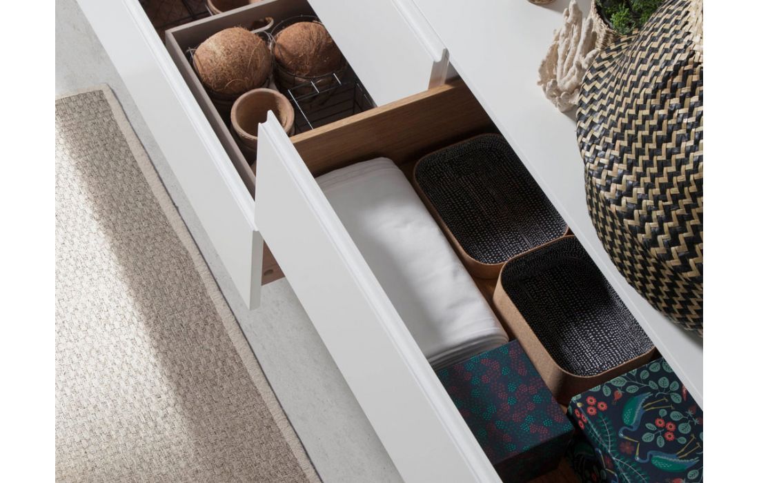 Aparador de 4 gavetas em MDF lacado com pés em aço inoxidável cromado