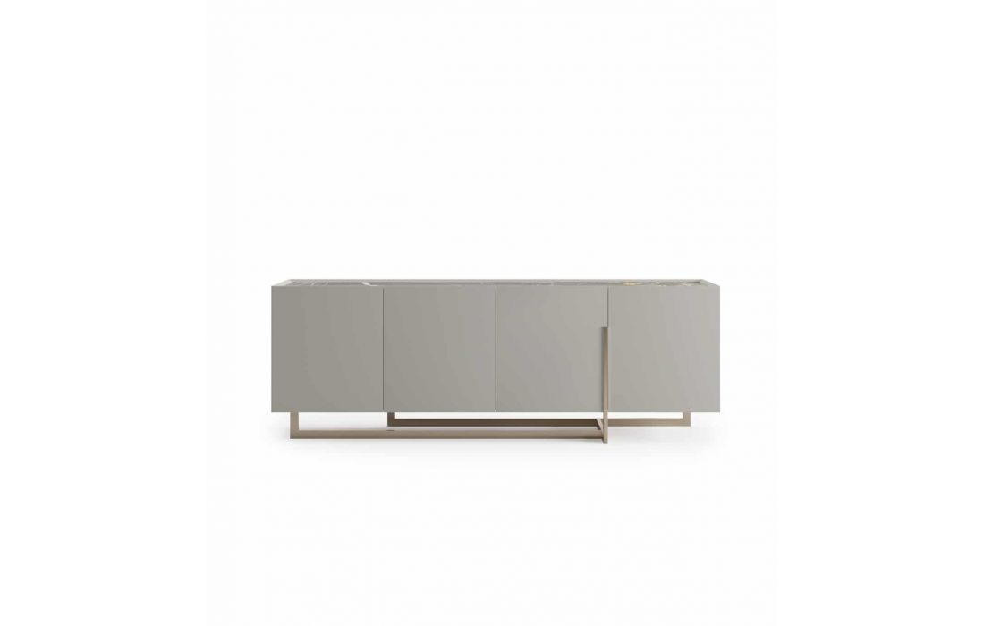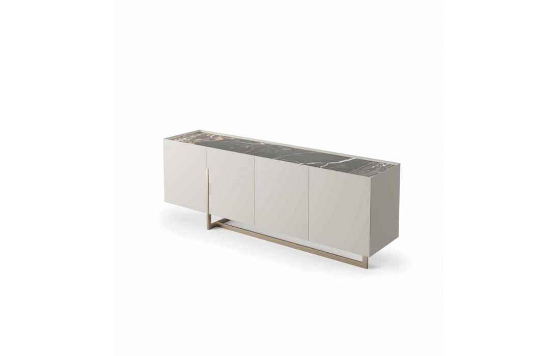Aparador lacado mate com pé inox ouro mate e tampo cerâmico. Prateleiras interiores e uma gaveta.