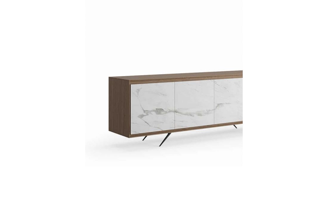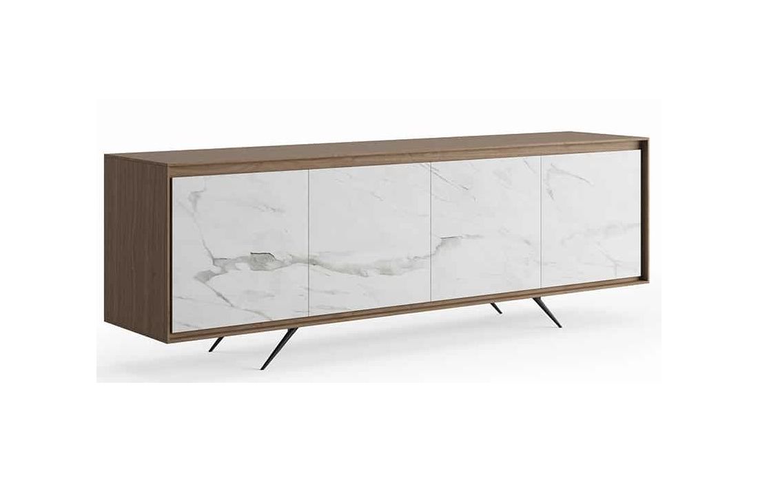 Aparador em MDF com estrutura em nogueira e pés em ferro lacados. Portas revestidas a cerâmica calacata com abertura “pull” pela alheta superior. Prateleiras interiores e uma gaveta.