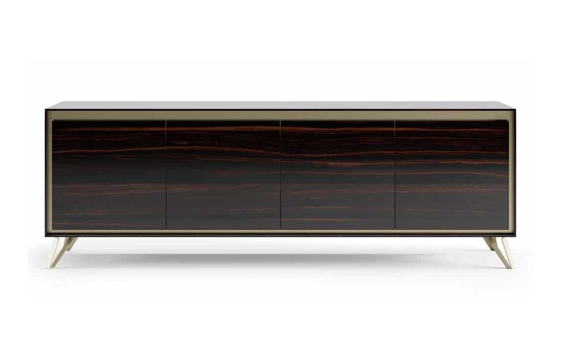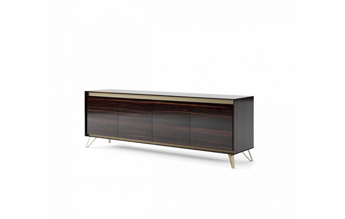 Aparador com estrutura e portas em MDF folheadas a ébano macassar, contorno das portas em polyrey latão escovado e pés em inox. Interior com prateleiras e gaveta.