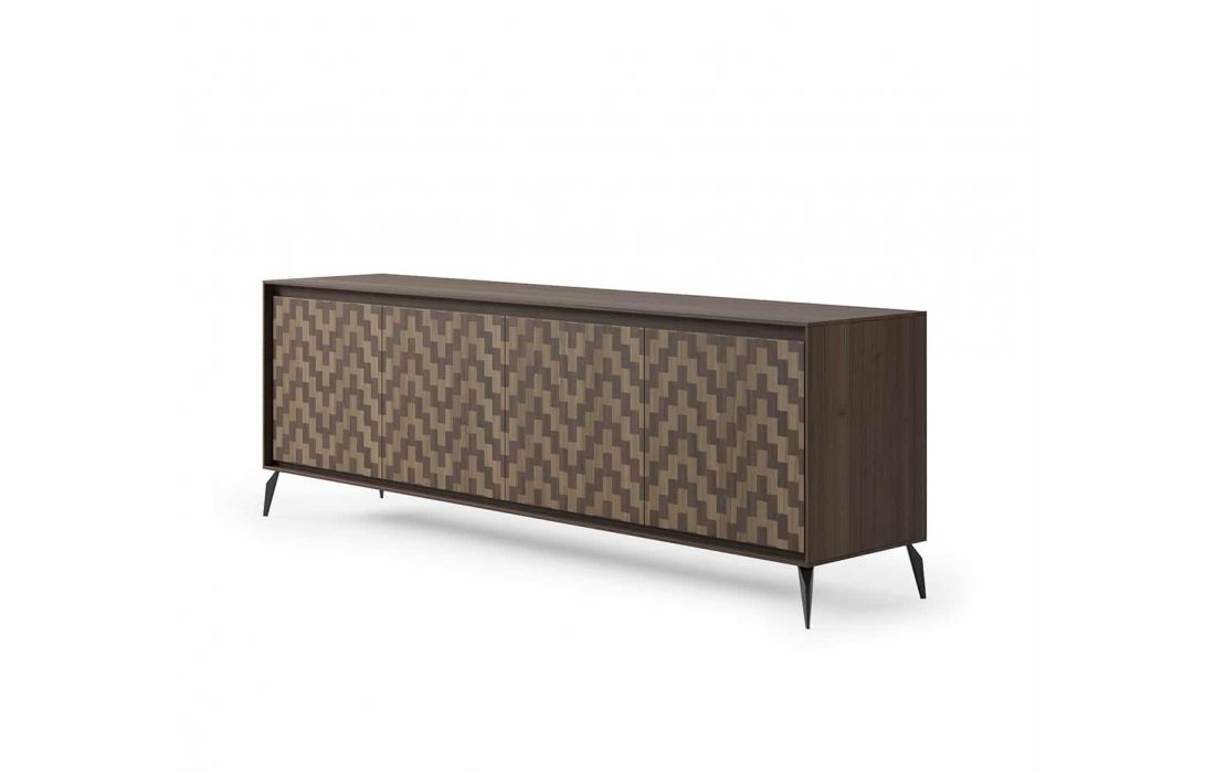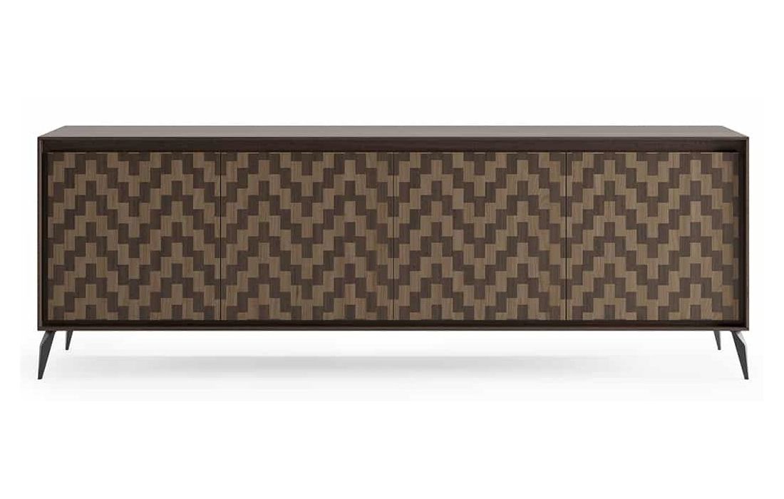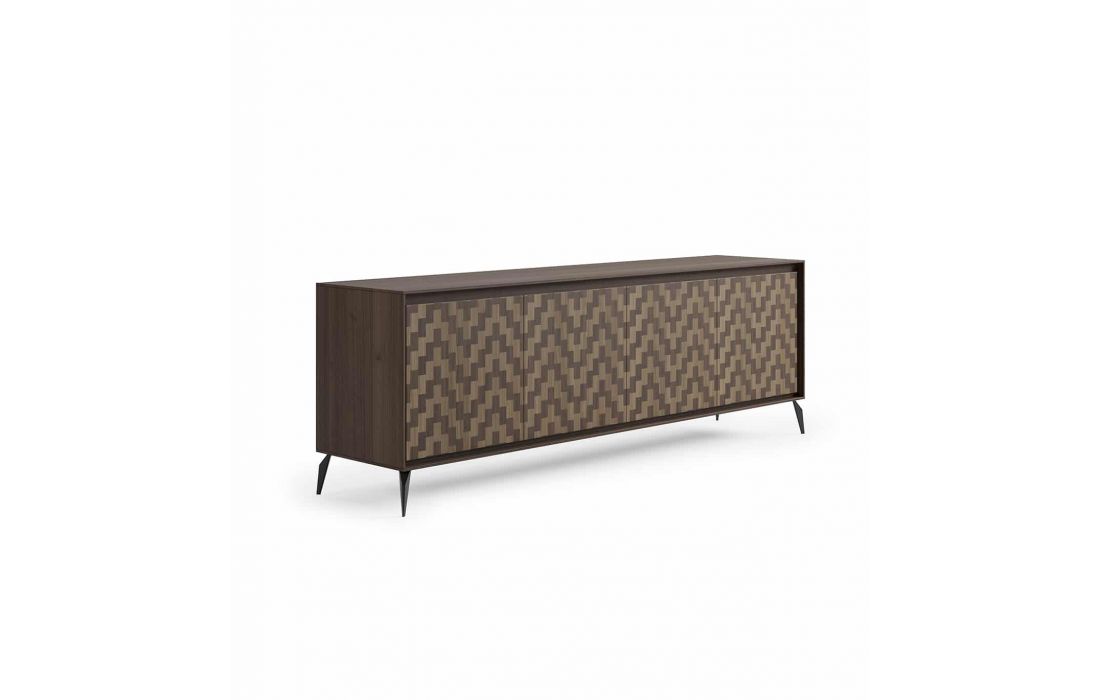 Aparador em MDF com estrutura em eucalipto fumado e pés em ferro lacados. Efeito “spina” nas portas em nogueira e eucalipto fumado. Prateleiras interiores e uma gaveta.