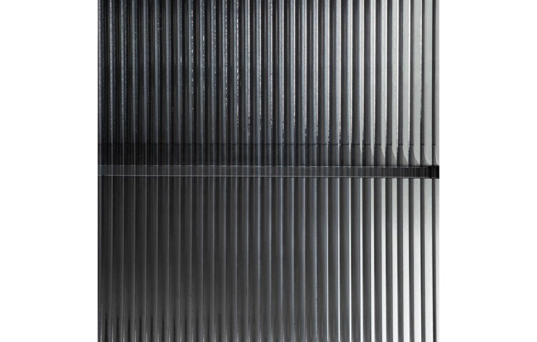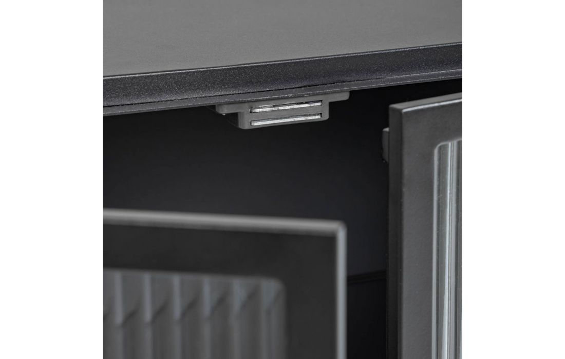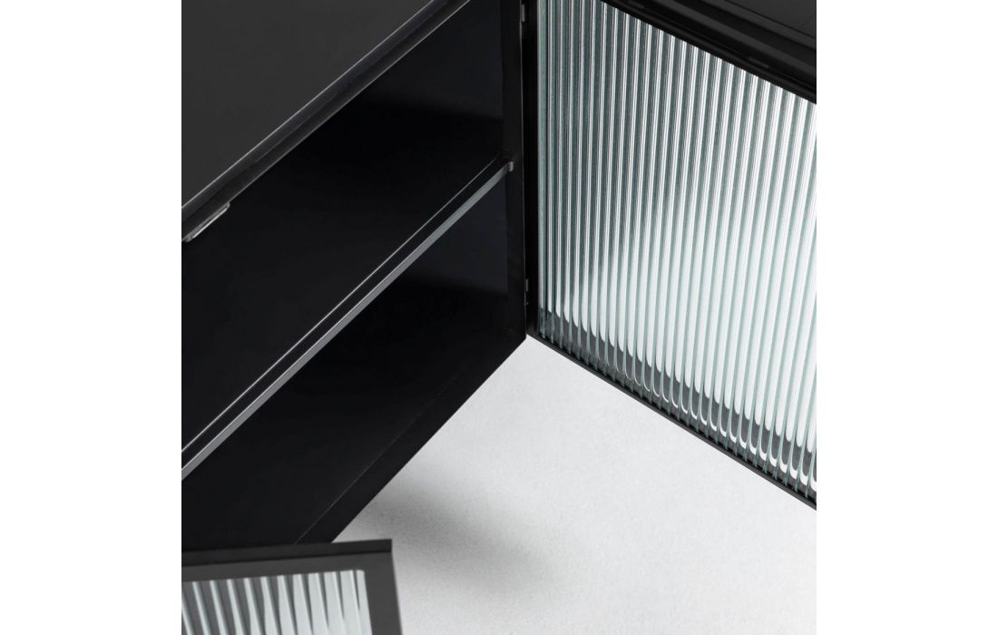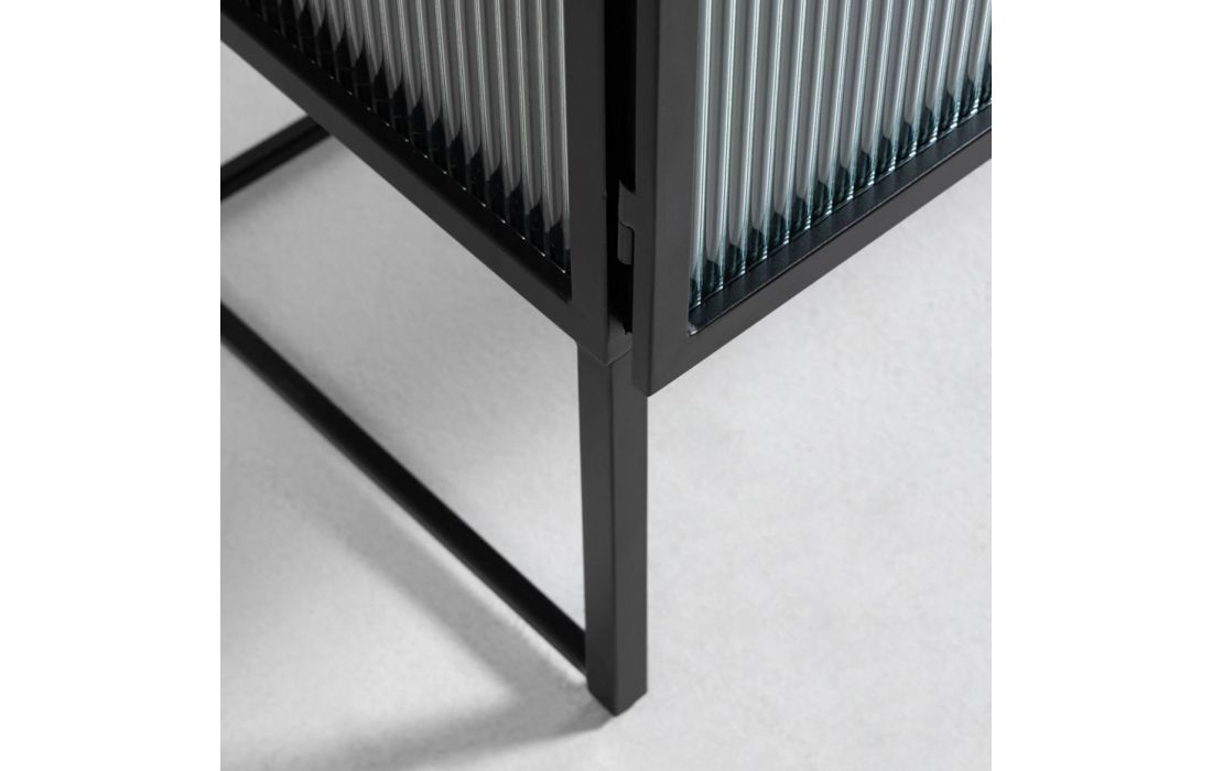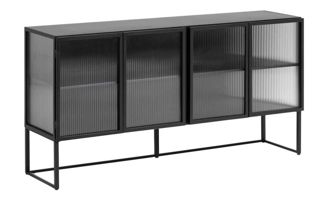 Aparador com estrutura em metal, laterais e frente em vidro.