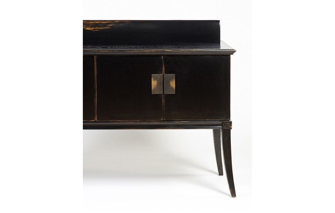 Aparador de estilo oriental na cor preto envelhecido. É composto por quatro portas com puxadores em latão envelhecido.Destinatário :