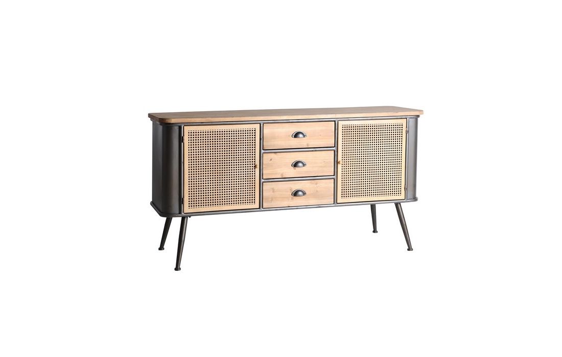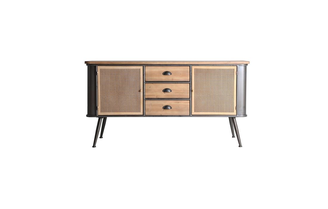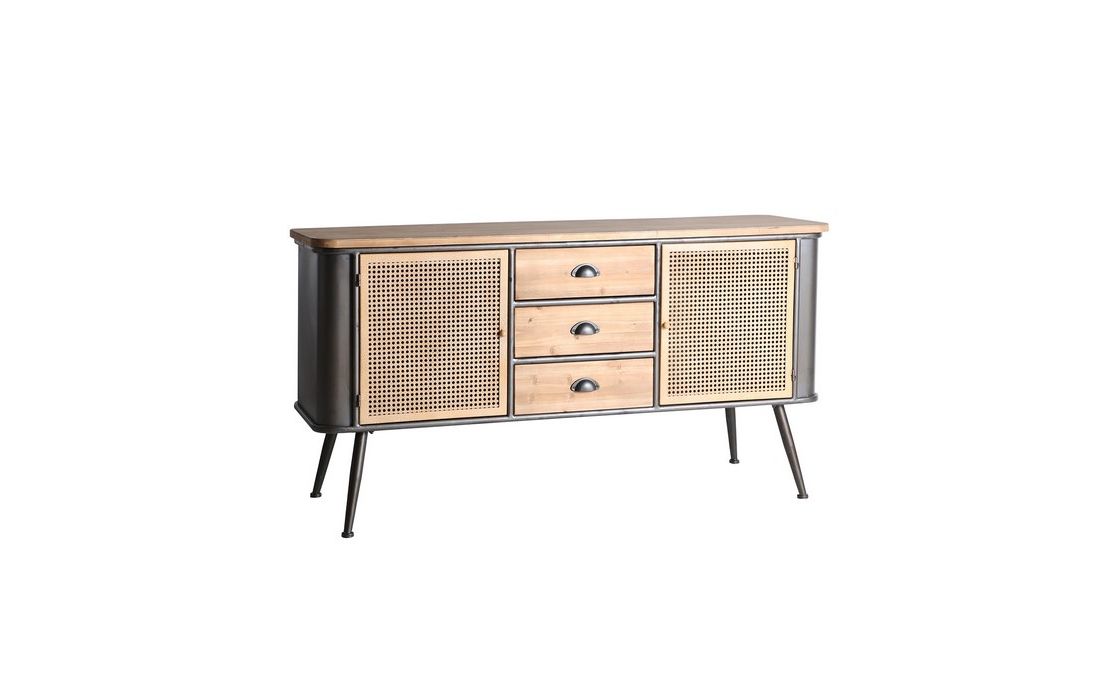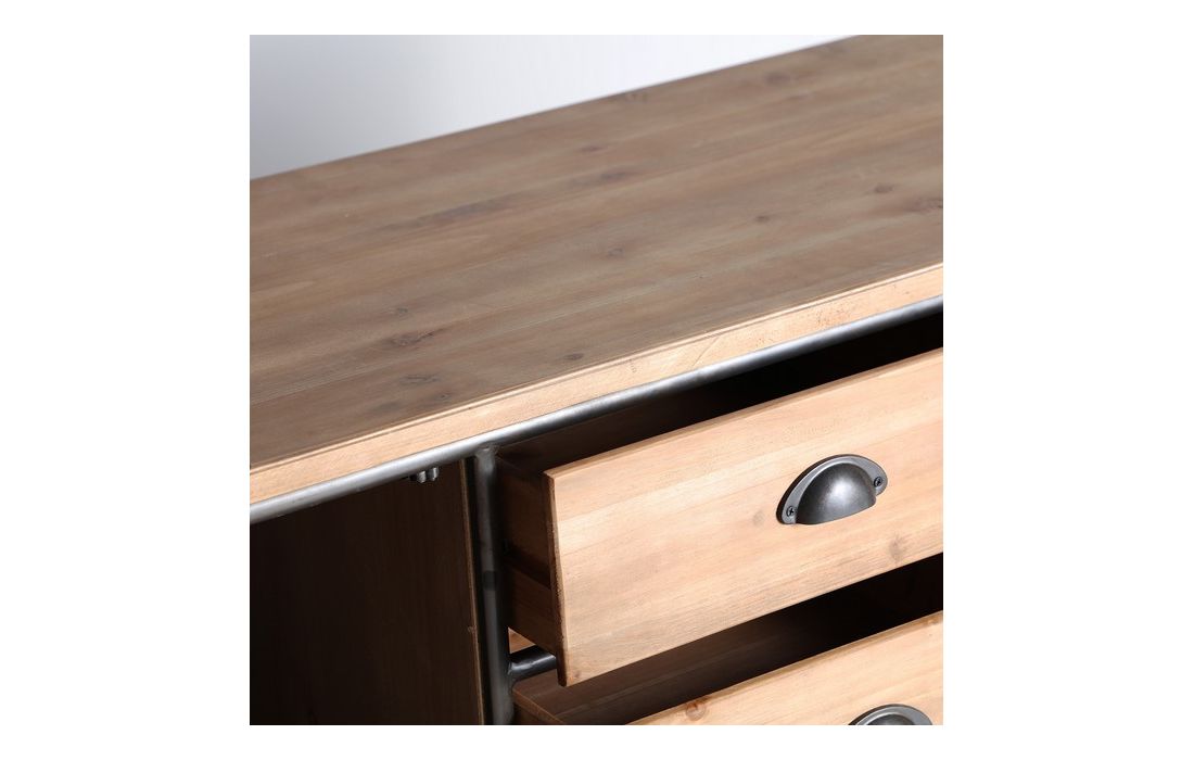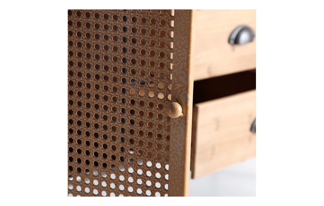 Aparador em madeira de abeto e ferro, possui 3 gavetas e uma porta com acabamento em grelha metálica