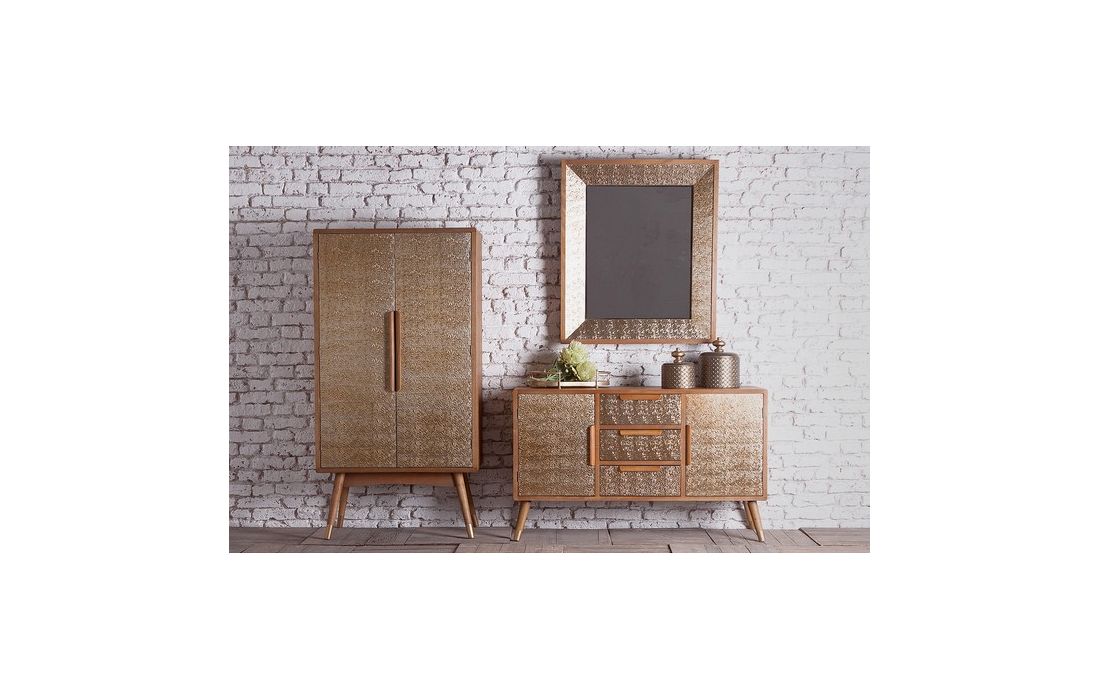 Aparador feito em MDF combinado com aço dourado, composto por duas portas e três gavetas com detalhes em relevo em dourado.