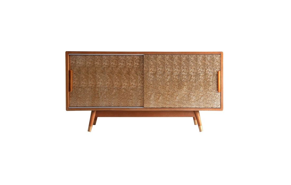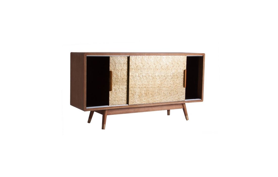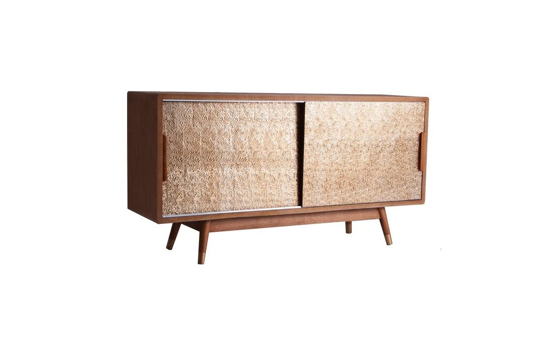 Aparador feito em MDF combinado com aço dourado, composto por duas portas de correr com detalhes em relevo em dourado.
