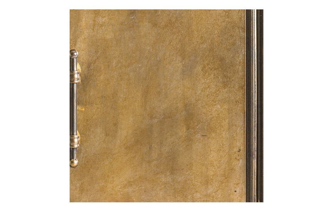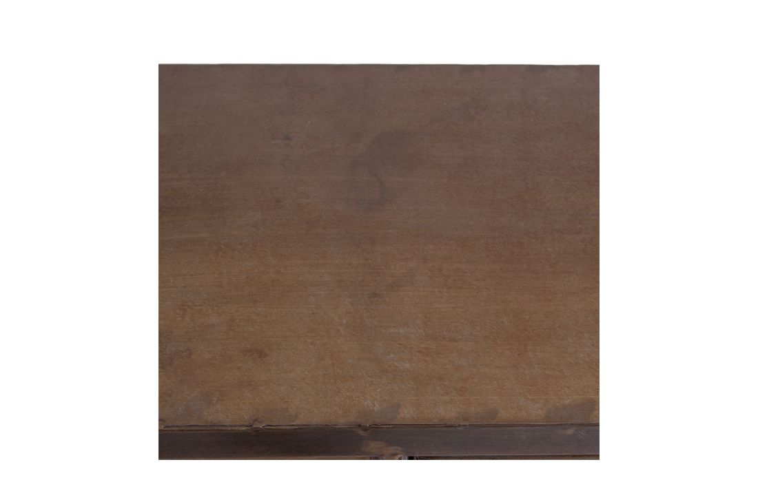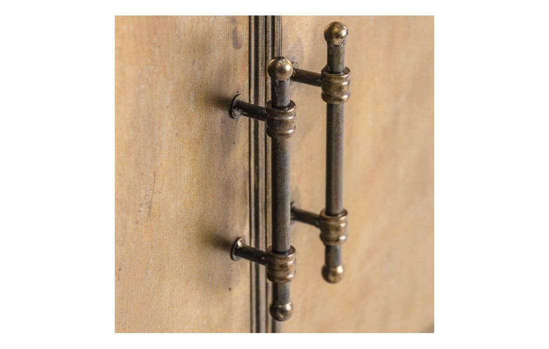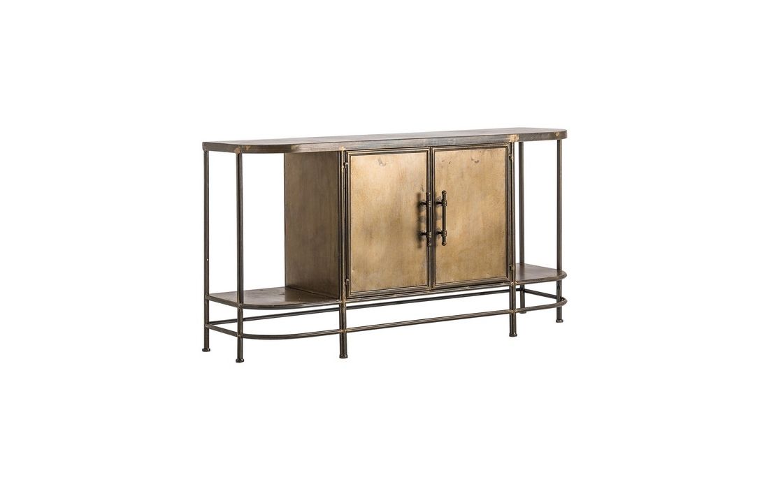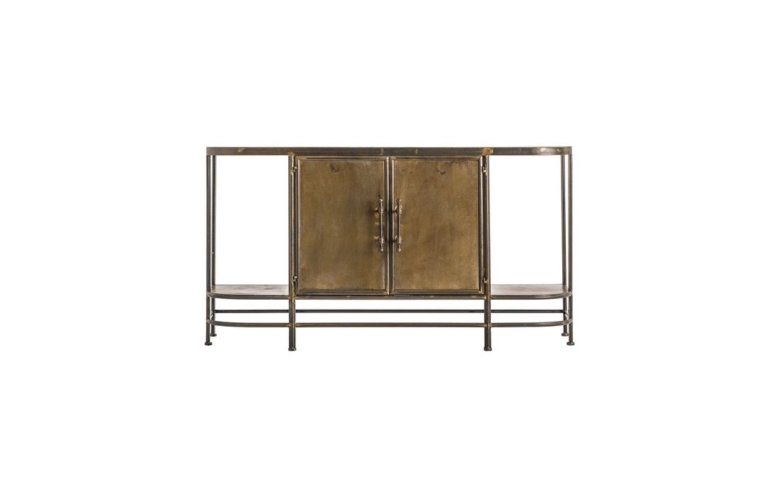 Aparador composto por uma estrutura de ferro preto com acabamento oxidado com toques dourados.