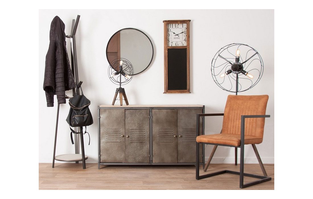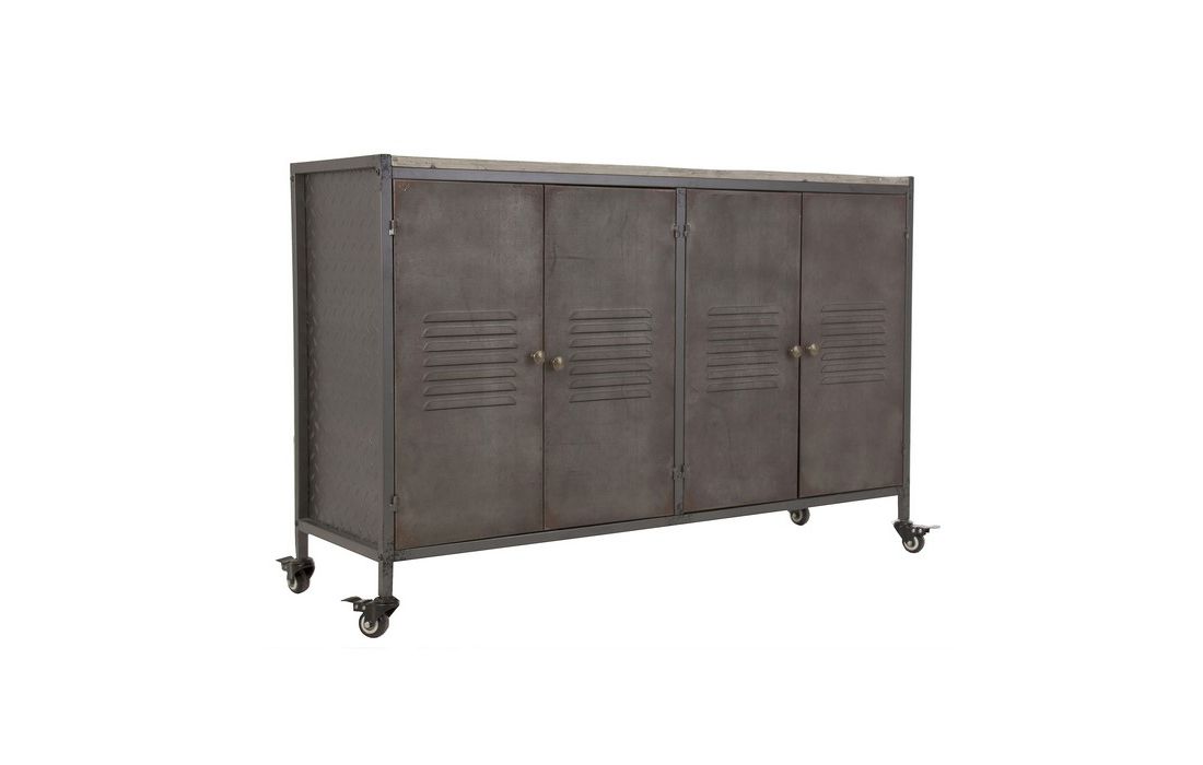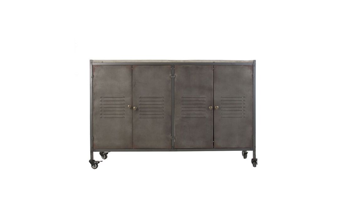 Aparador feito de ferro com acabamento envelhecido combinado com madeira de abeto.