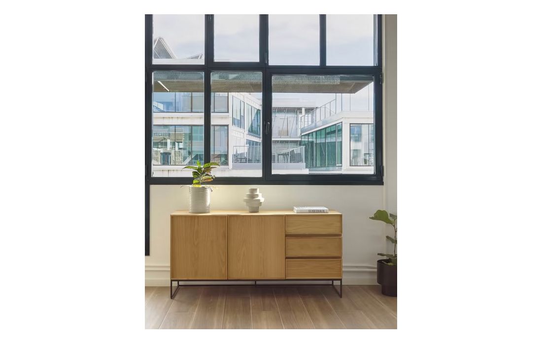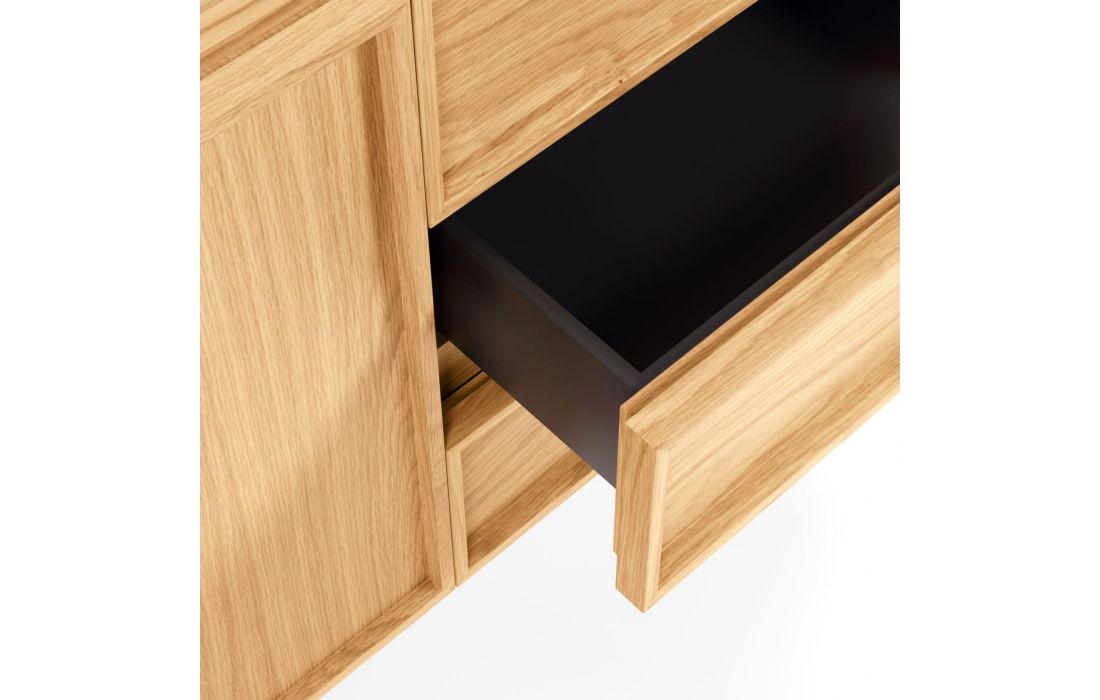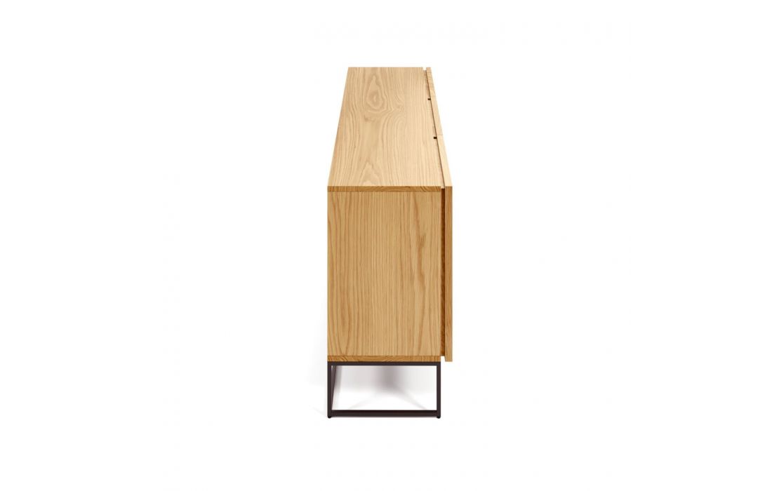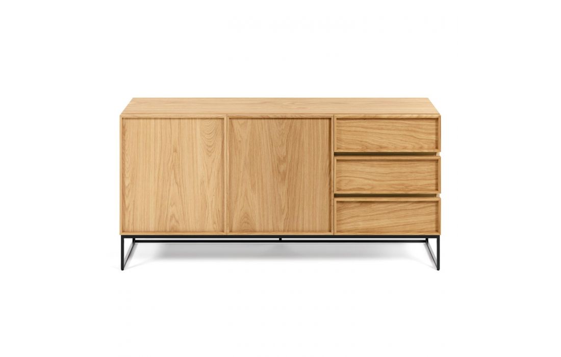 Aparador de 2 portas e 3 gavetas em mdf folheado a carvalho com pés metalicos na cor preto