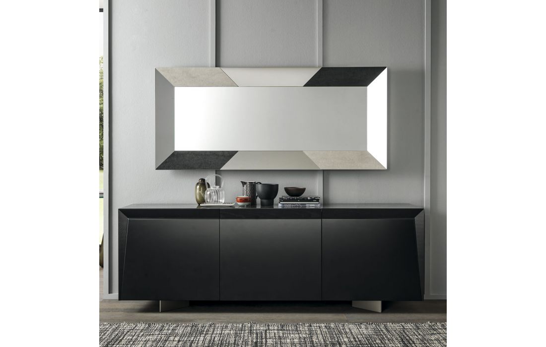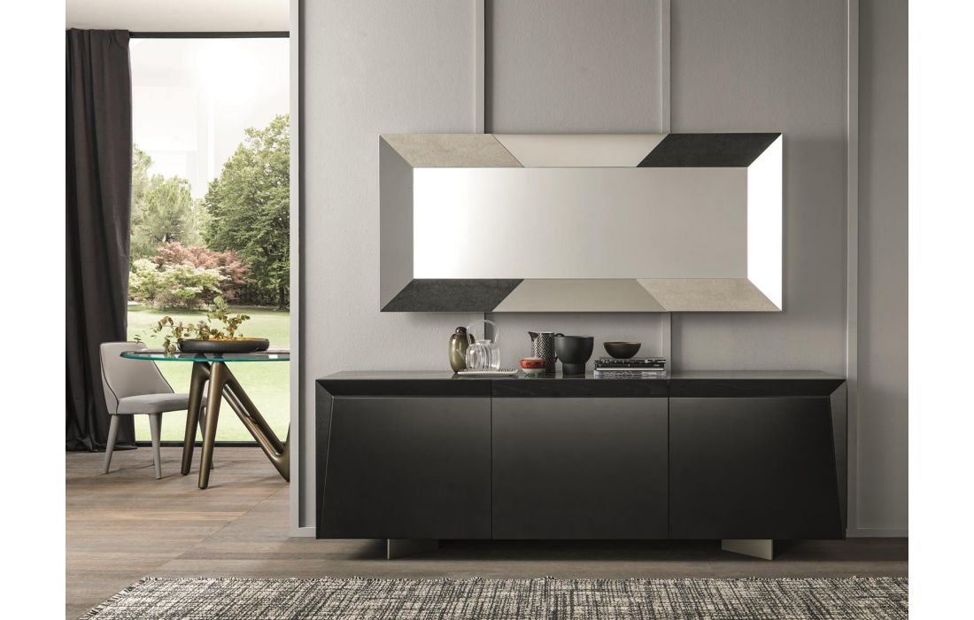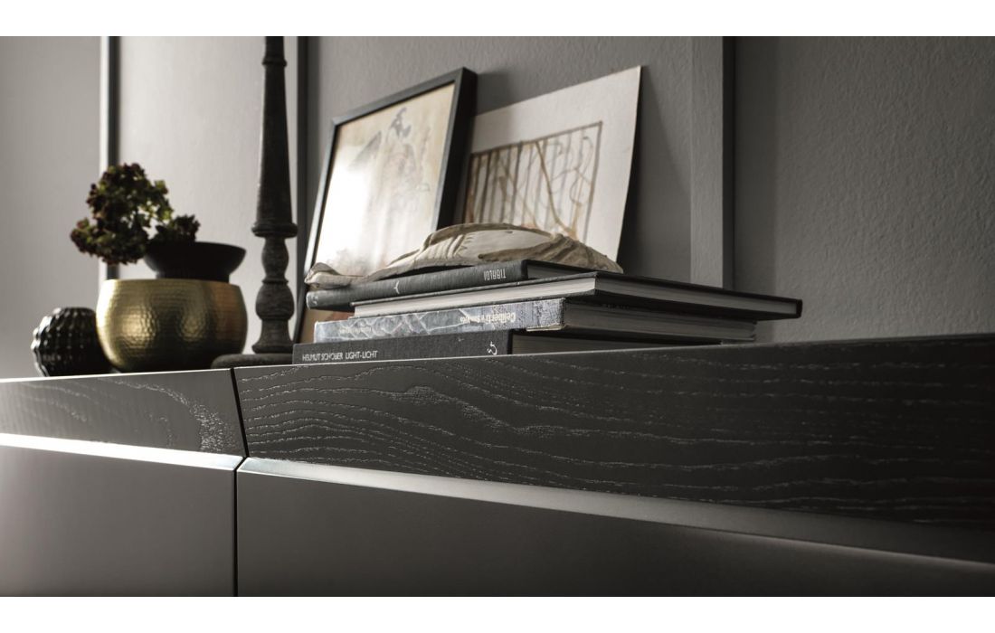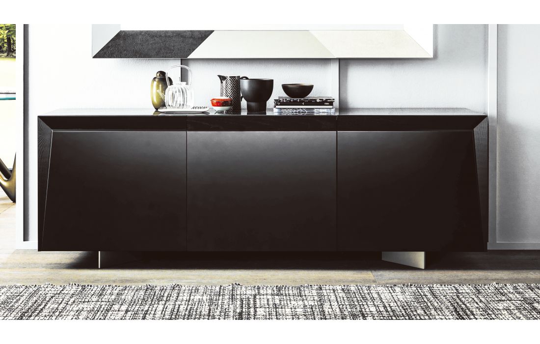 Aparador lacado com 3 portas. Portas da parte superior em madeira maciça com três prateleiras interiores em vidro temperado transparente.