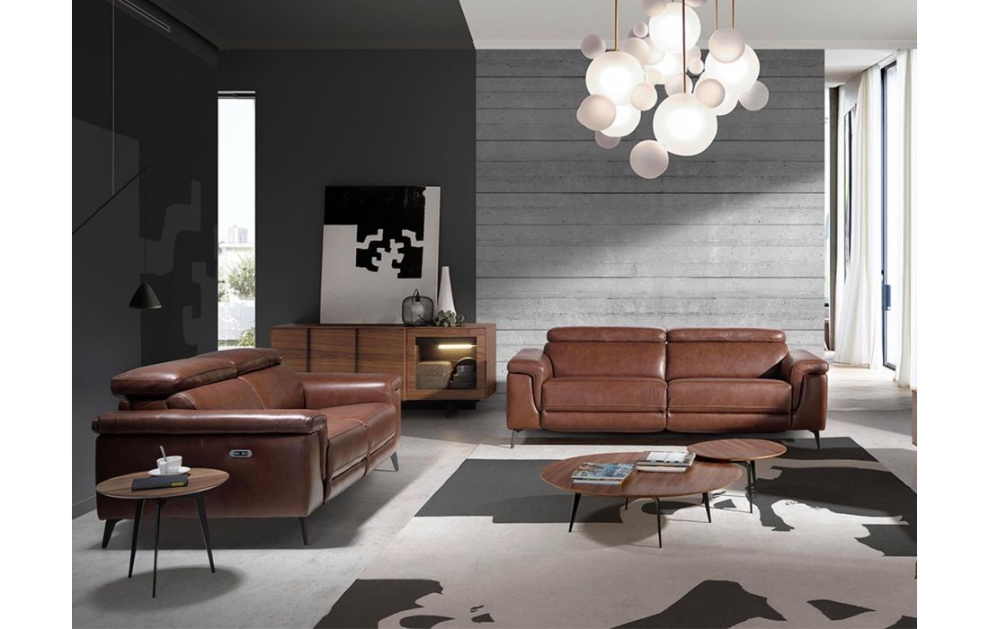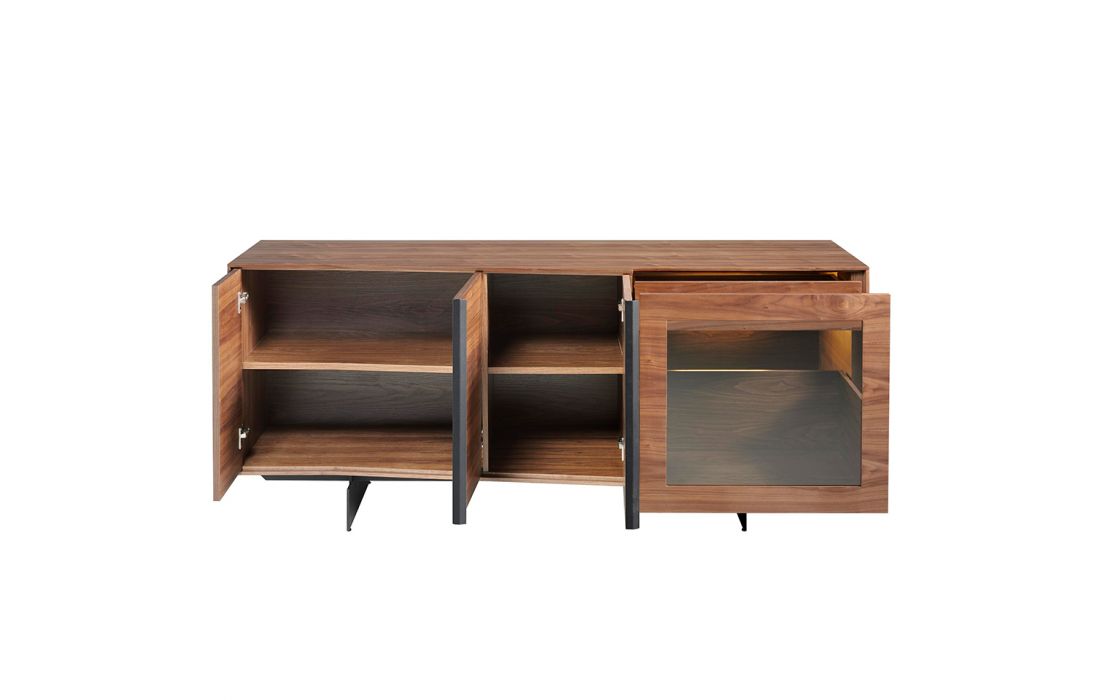 Aparador em madeira folheada a nogueira natural com três armários e duas gavetas. Gaveta exterior com iluminação LED no interior.