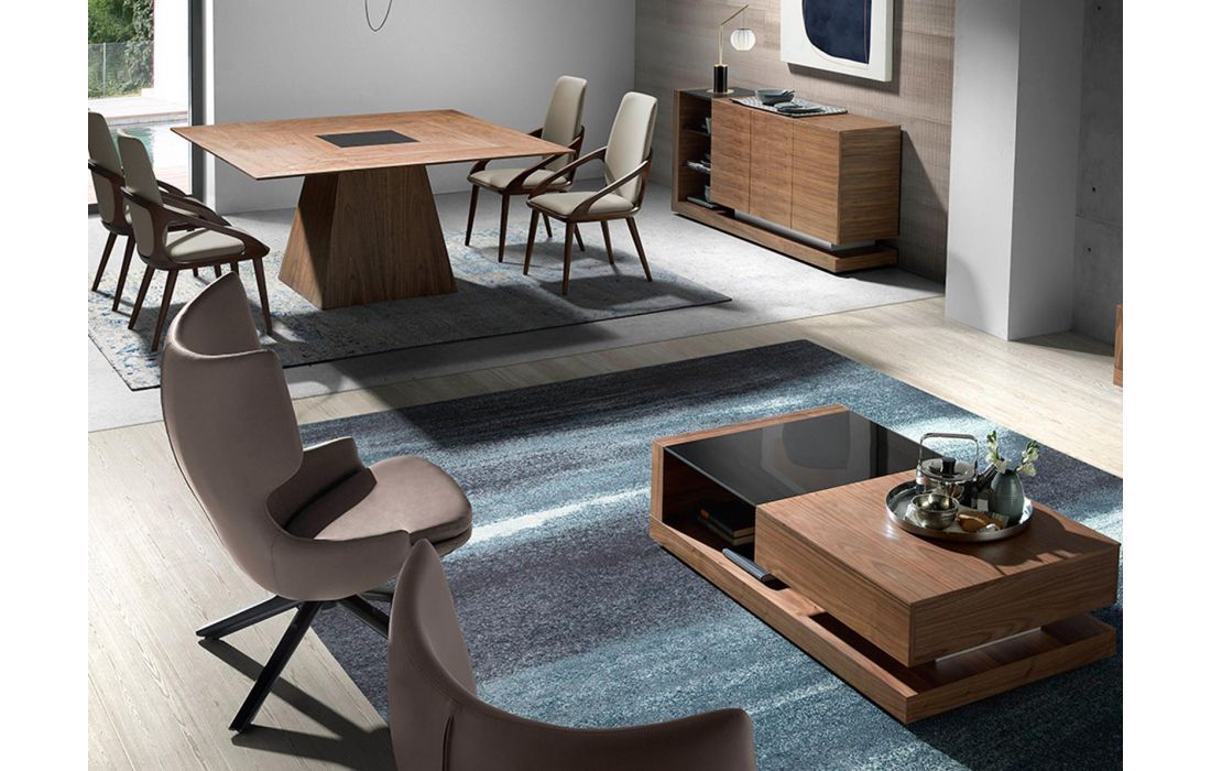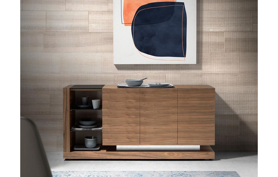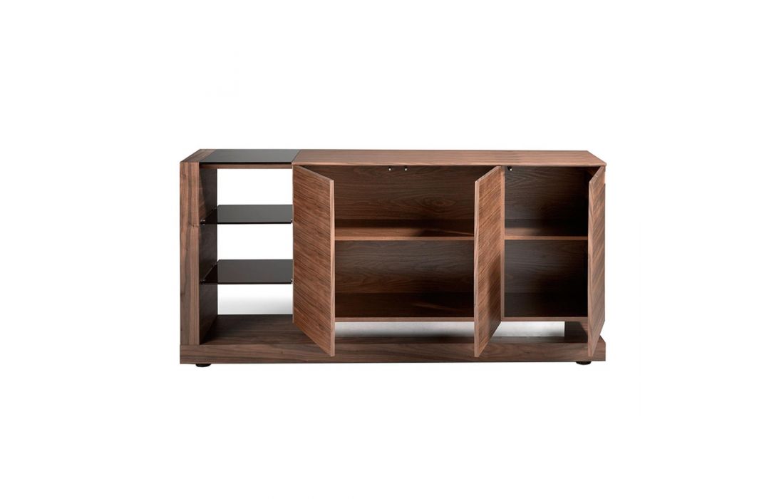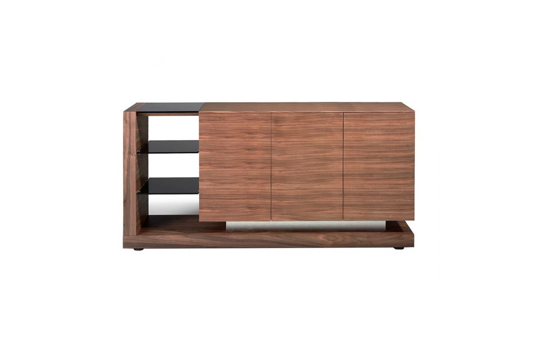 Aparador moderno com estrutura em MDF de nogueira e pés em aço inoxidável, com tampo de vidro e o seu detalhe original em aço inoxidável, dispõe de um amplo espaço de arrumação com 3 portasDestinatário :