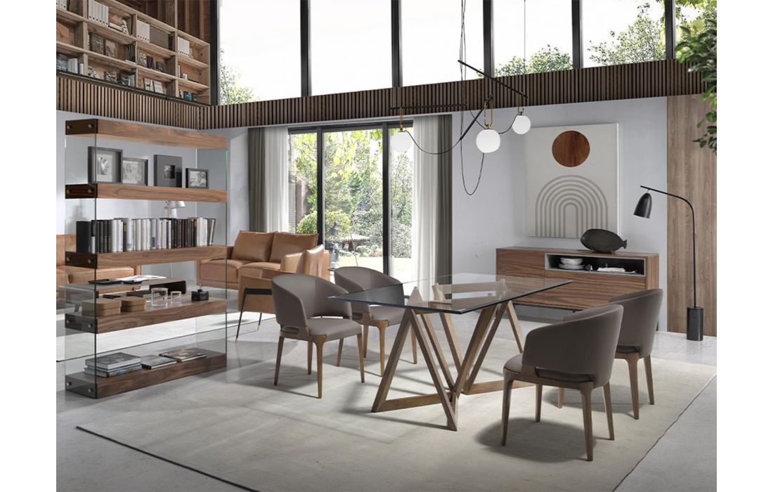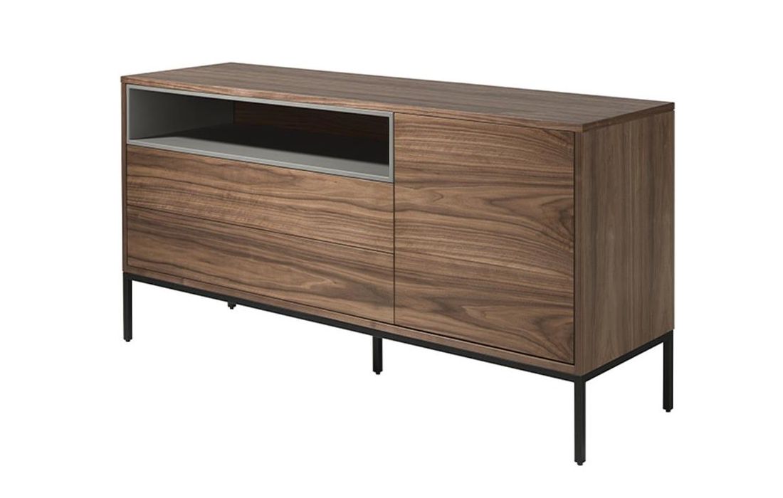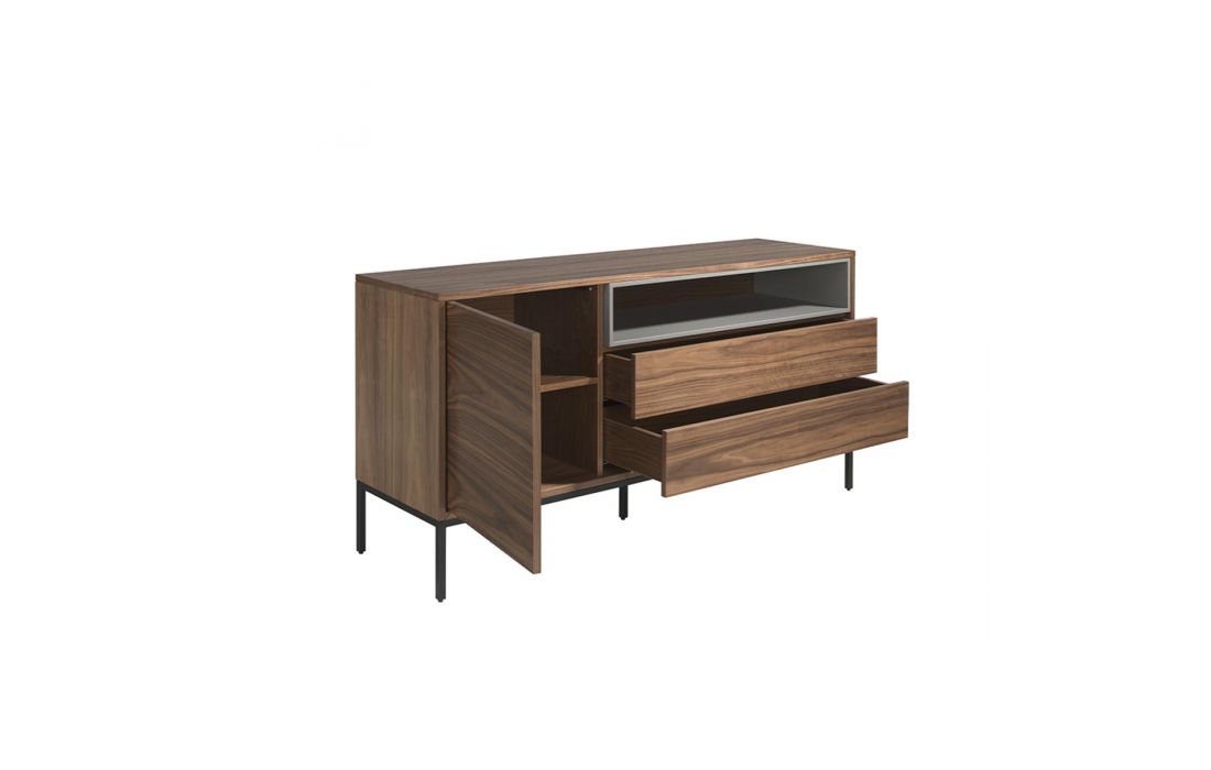 Aparador de madeira folheada a nogueira com duas gavetas e uma porta suspensa. Tem um espaço de arrumação em madeira DM lacada a Cinzento Mate. Estrutura das pernas em aço maciço pintado em preto.