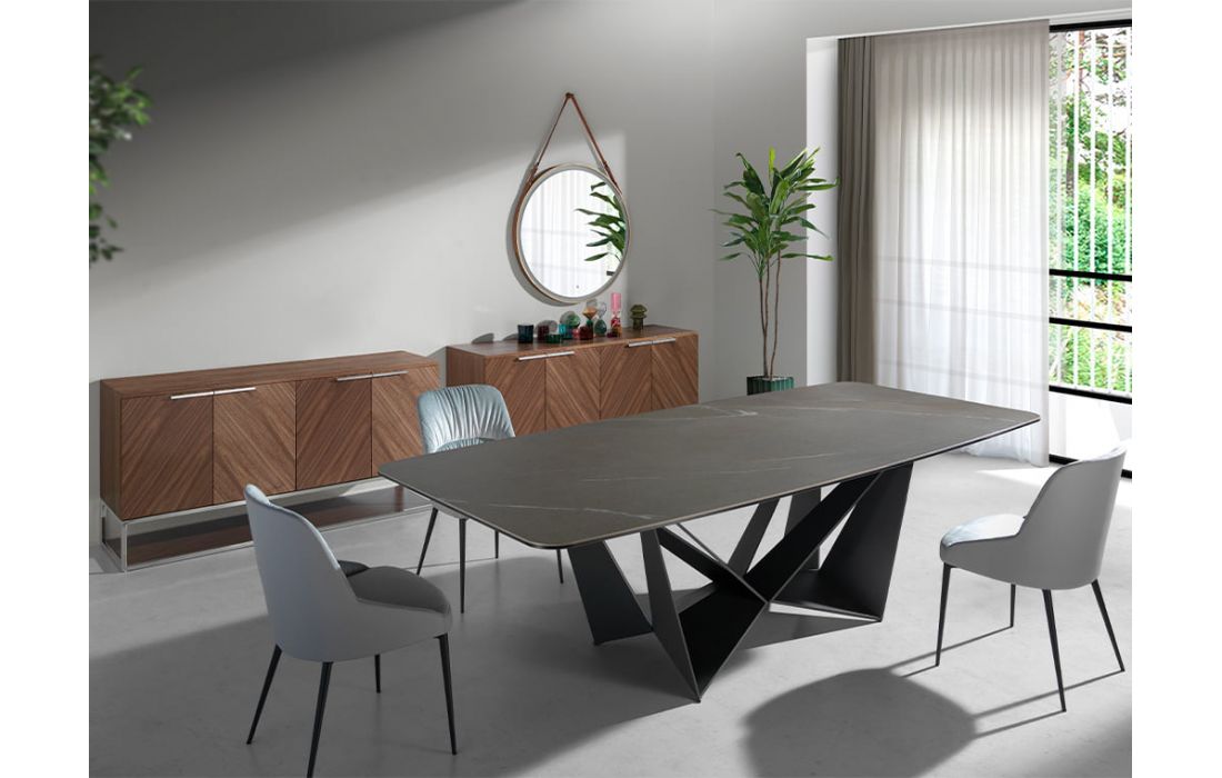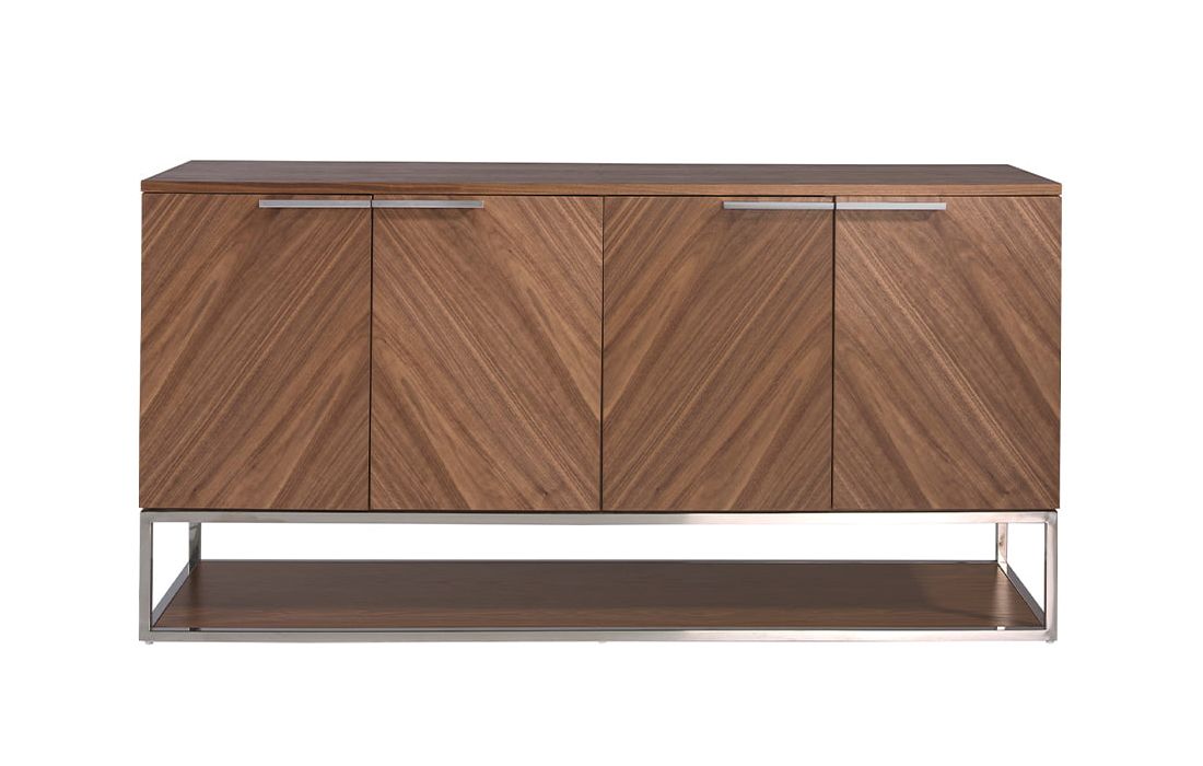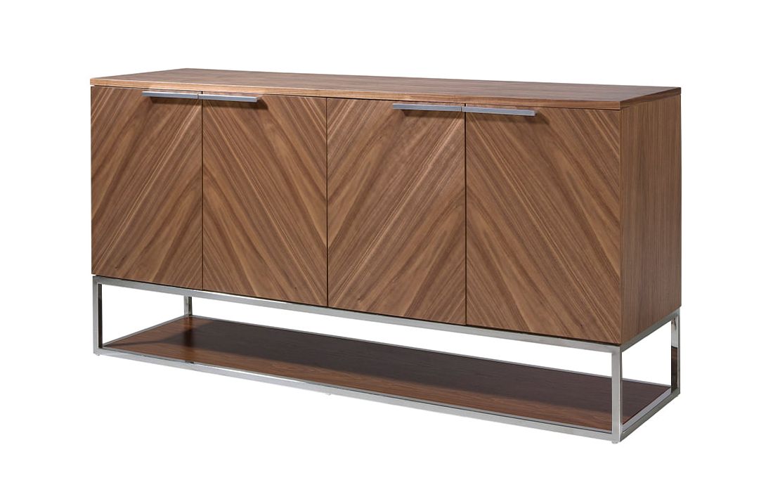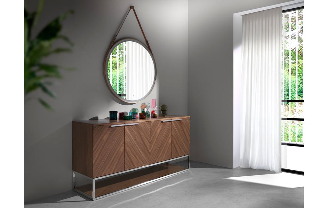 Aparador folheado a nogueira com 4 portas e prateleiras interiores para arrumação, estrutura dos pés e puxadores em aço inoxidável cromadoDestinatário :