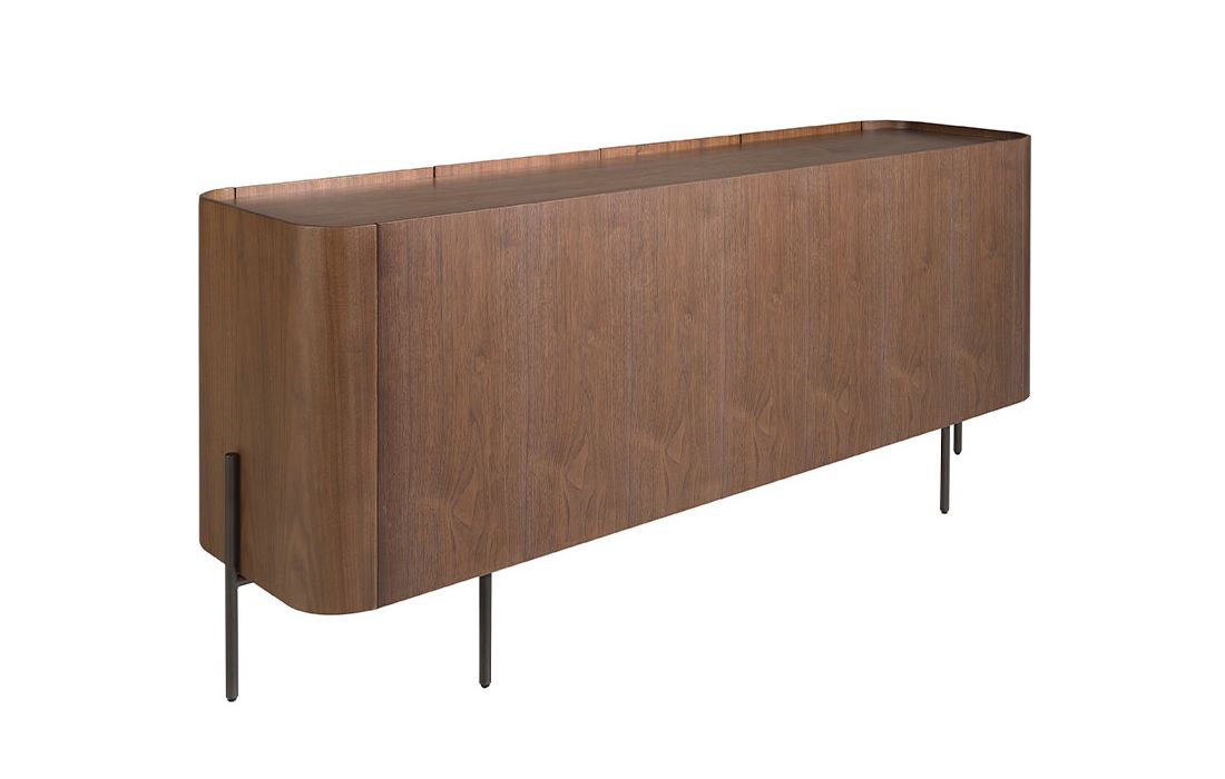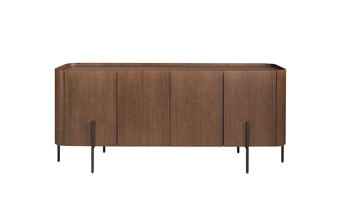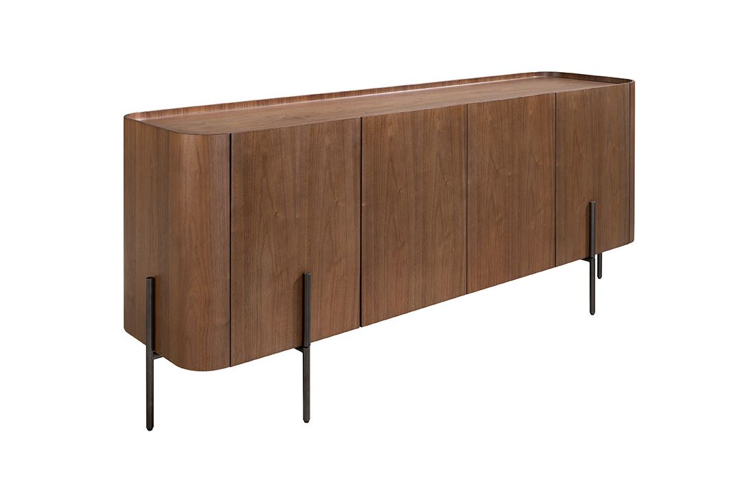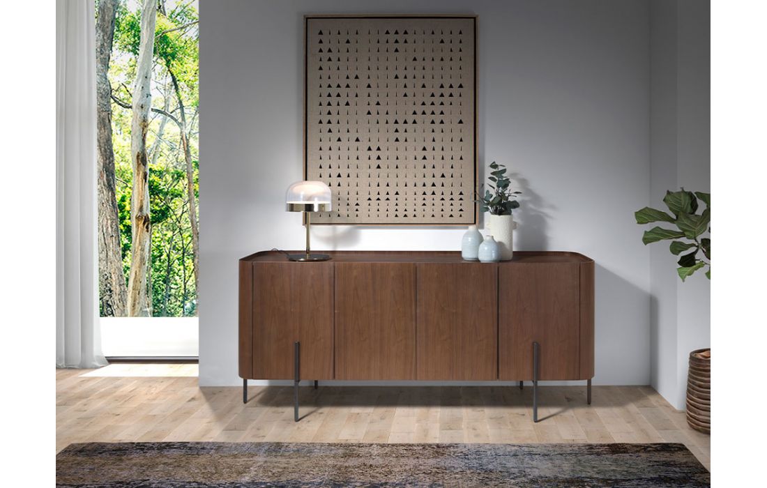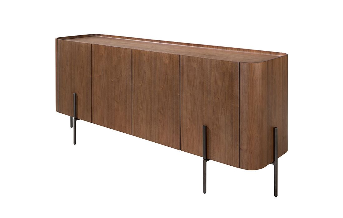 Aparador folheado a nogueira com quatro portas e prateleiras internas de vidro temperado e estrutura dos pés em aço inoxidável preto