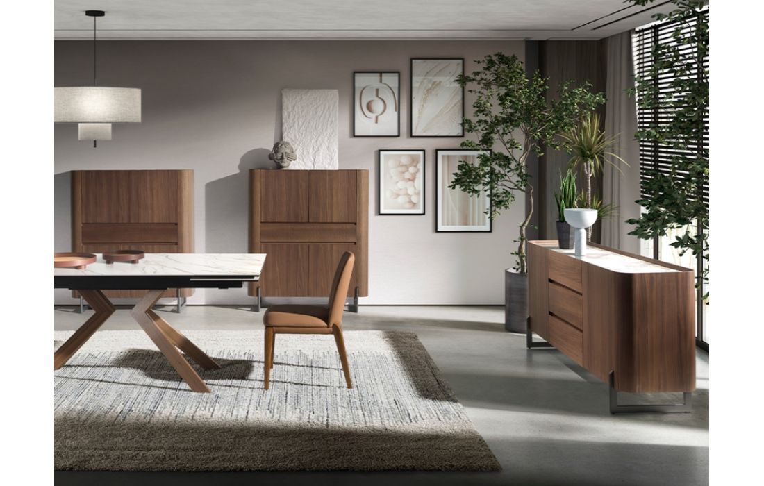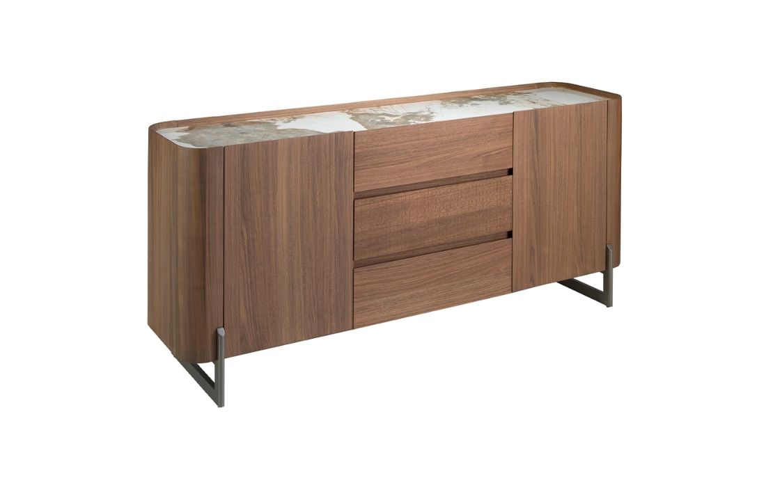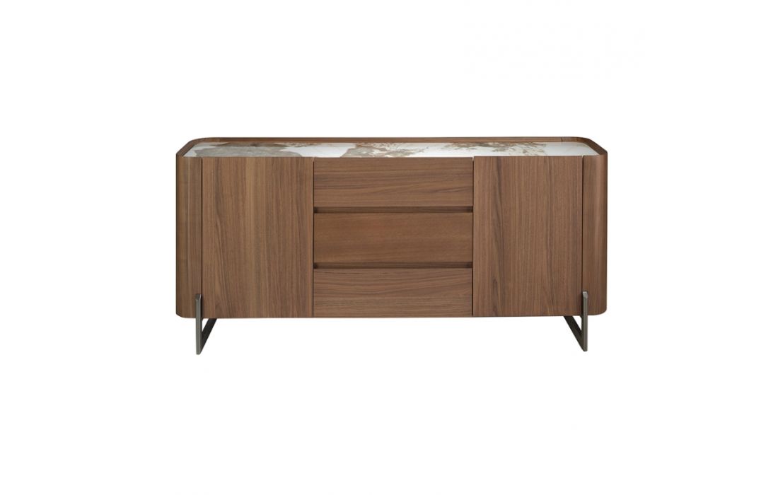 Aparador moderno com estrutura em MDF de nogueira natural e pernas em aço inoxidável, com tampo em mármore em acabamento brilhante e um espaço de arrumação com 3 gavetas e 2 portas com parteleira em vidroDestinatário :