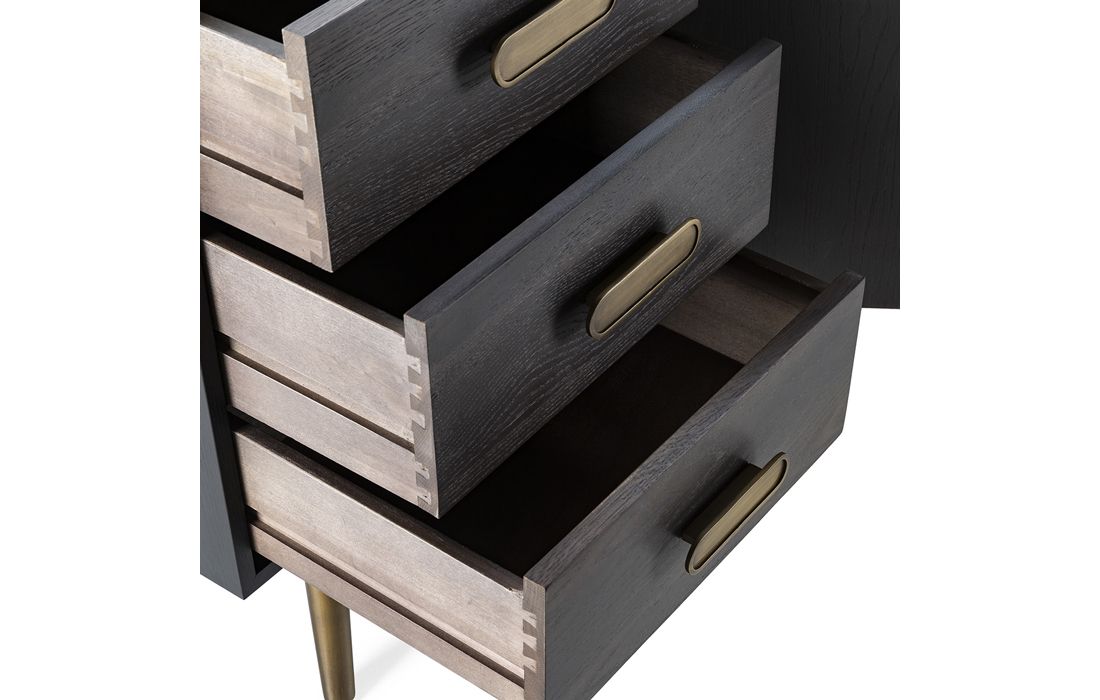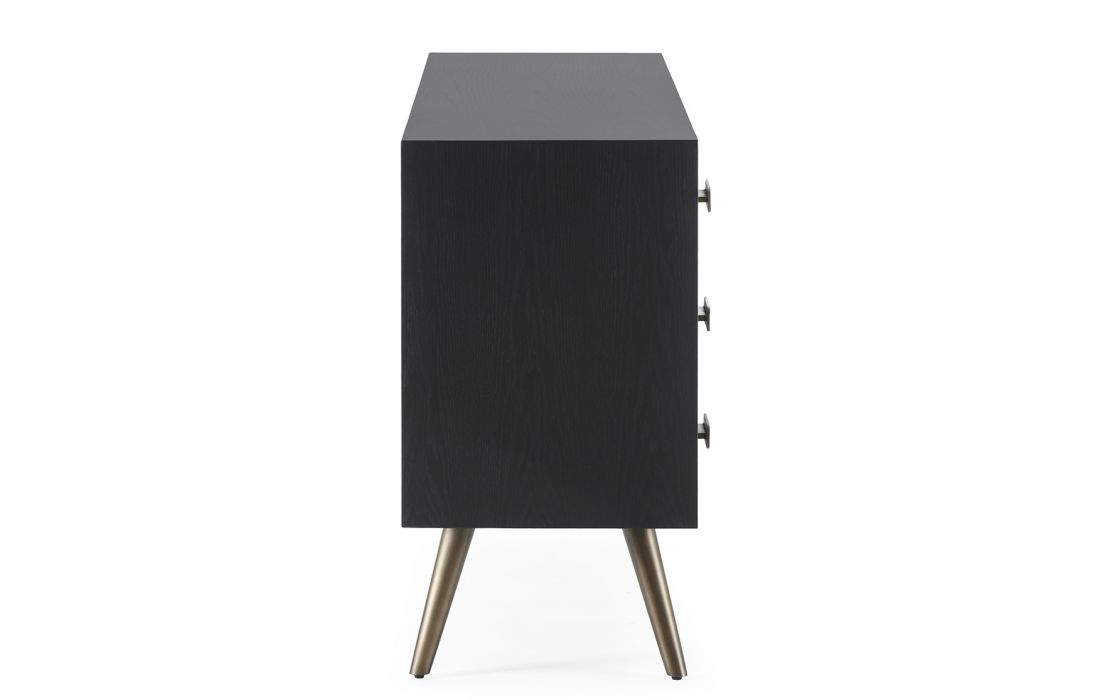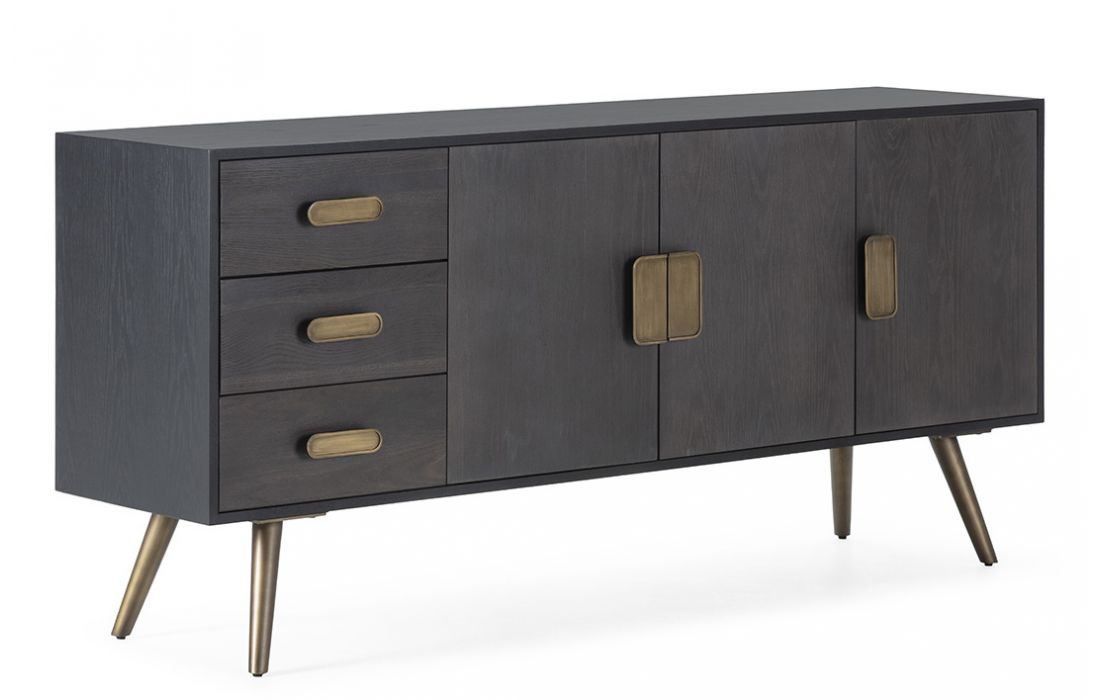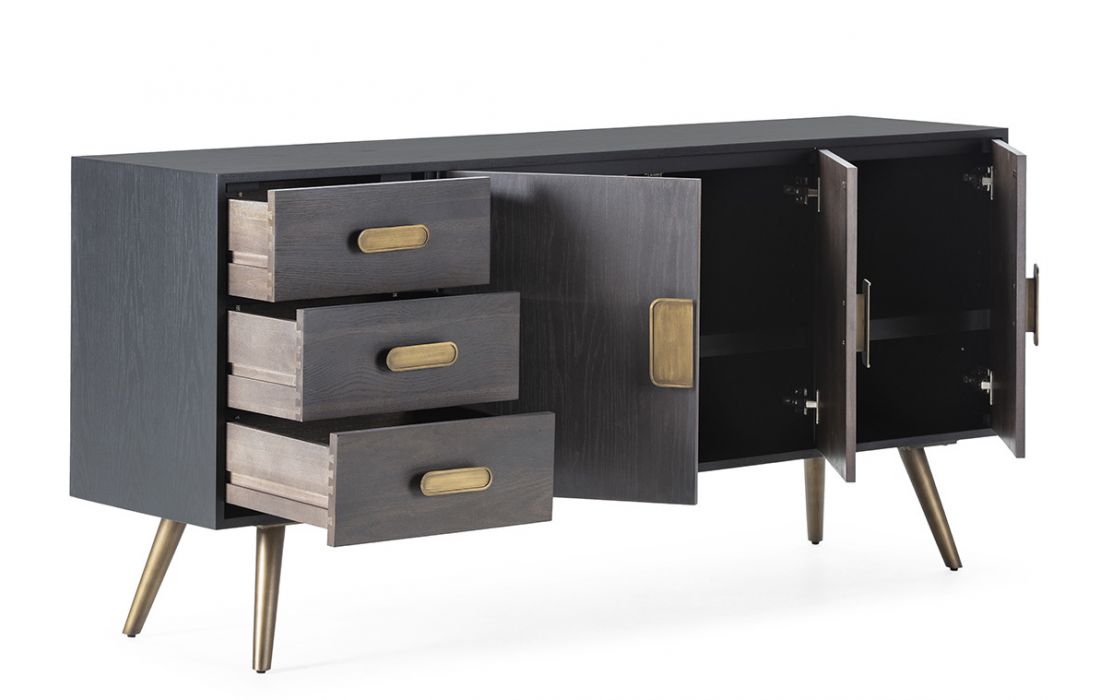 Aparador de 3 portas e 3 gavetas em madeira de carvalho cor preta com pés de metal dourado