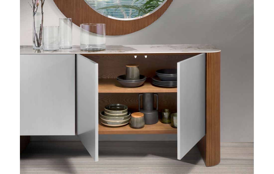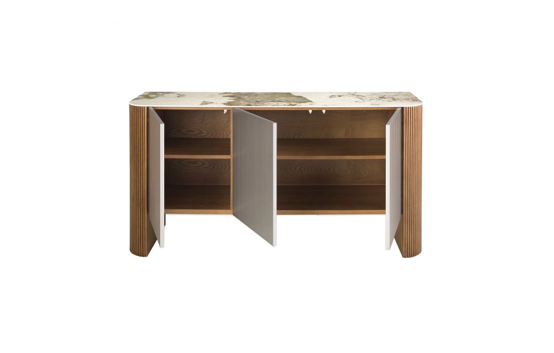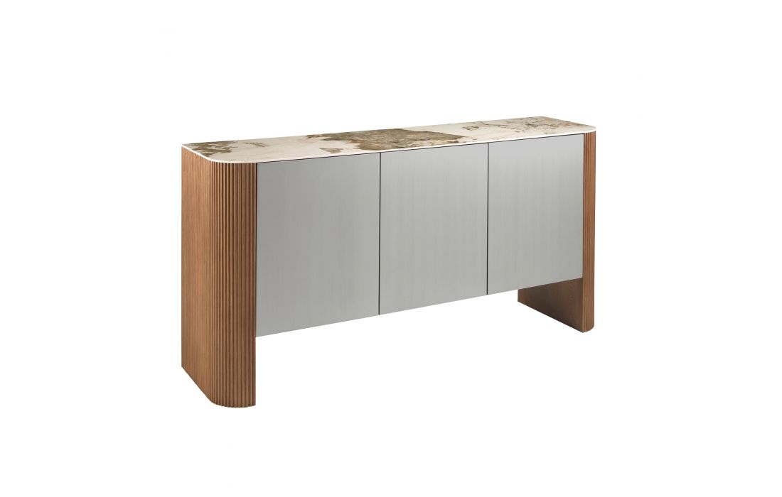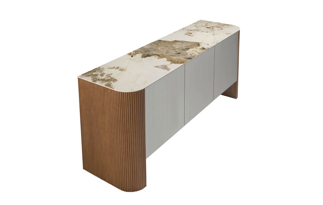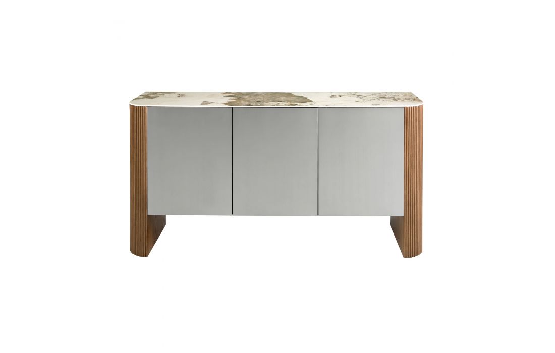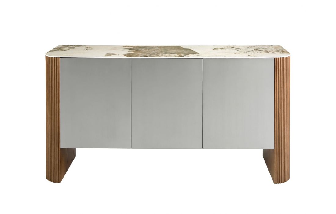 Aparador de 3 portas com design moderno com estrutura em madeira MDF lacado na cor prata e pés em MDF de nogueira, tampo em mármore branco com veios em tons de cinzento e castanho com um acabamento brilhanteDestinatário :