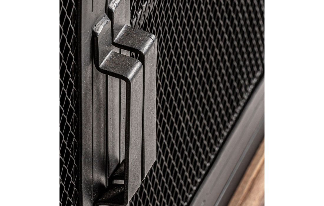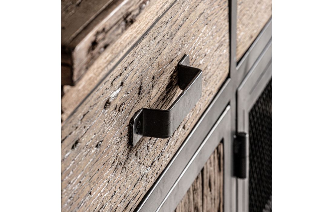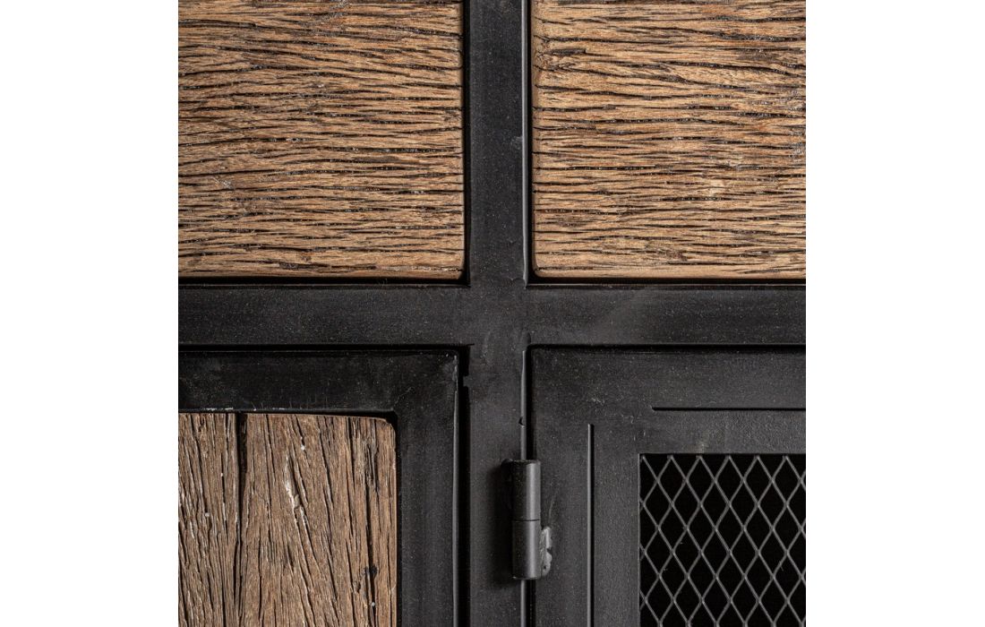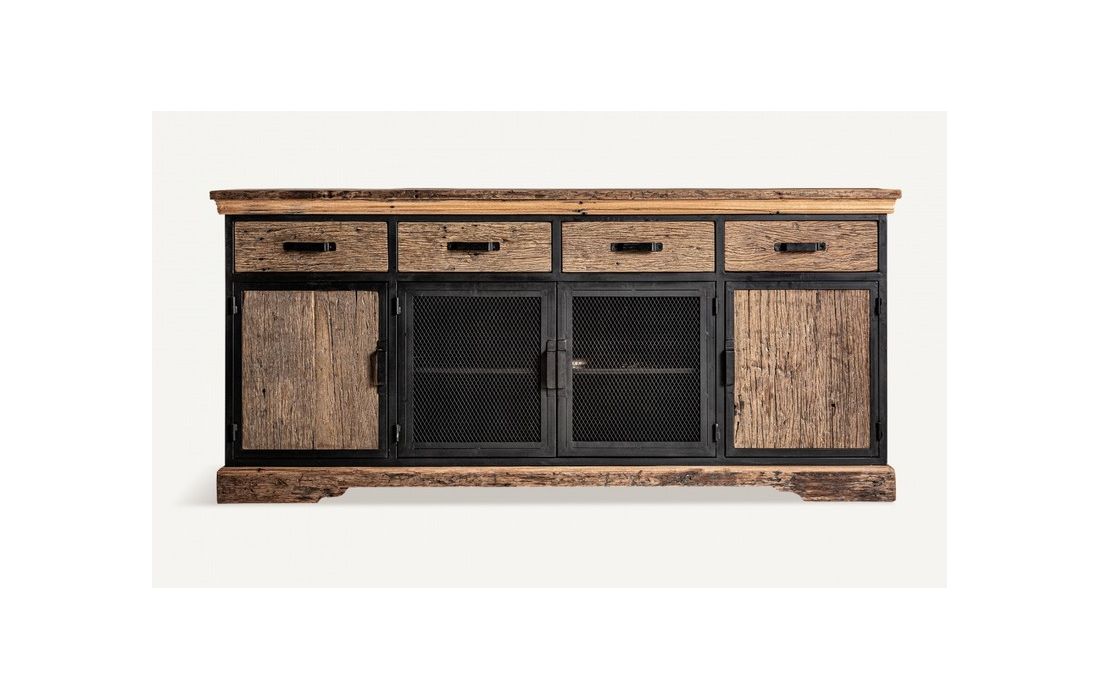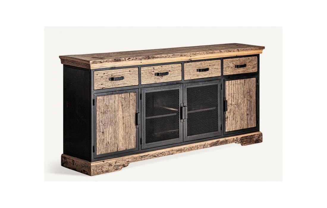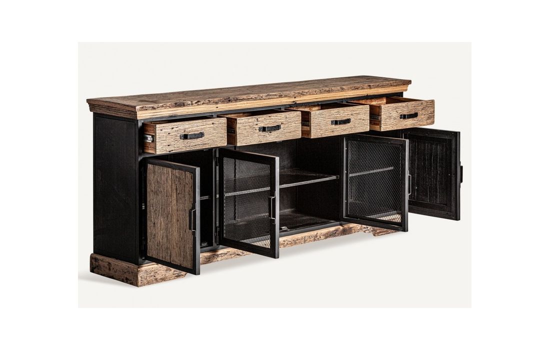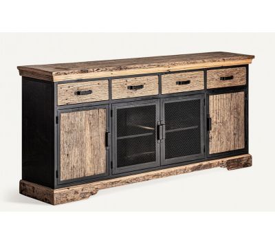 Aparador em ferro na cor preta combinado com madeira recuperada, inclui 4 gavetas e 4 portas