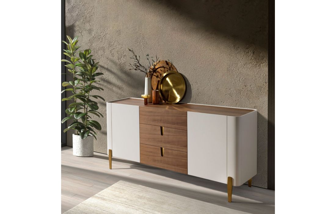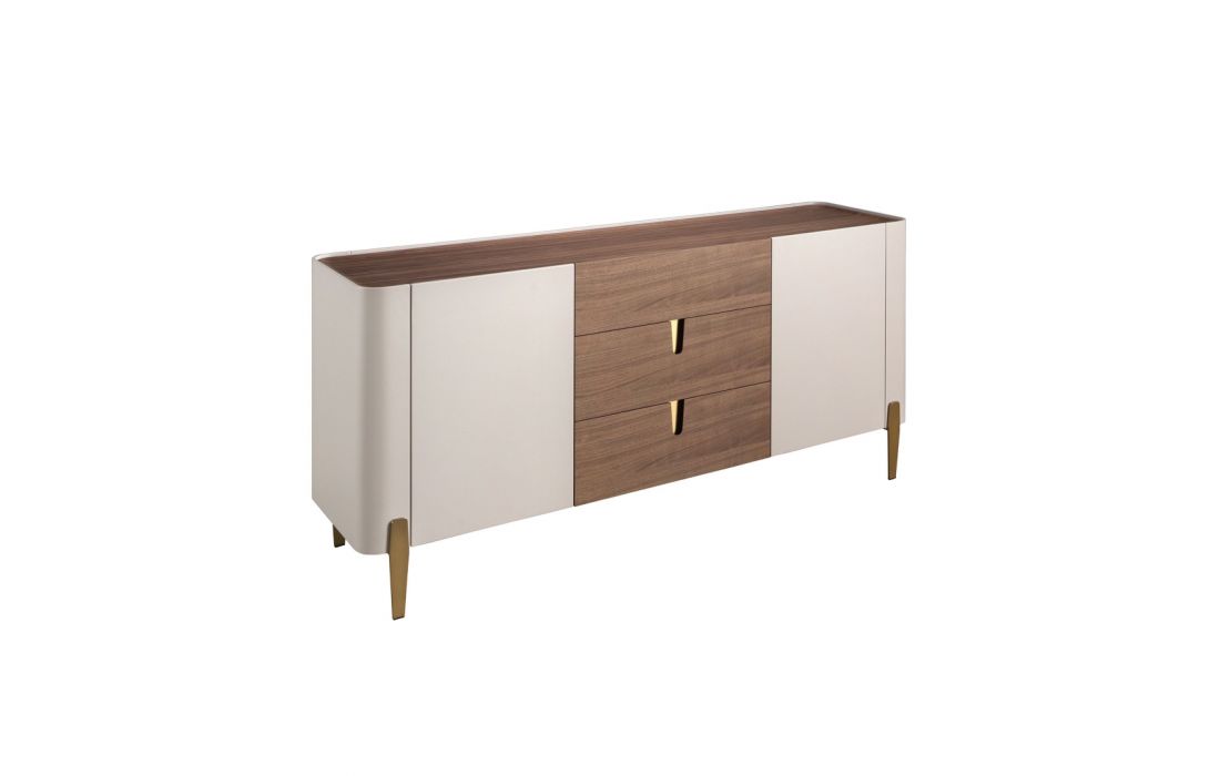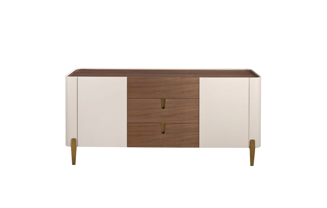 Aparador moderno com folheado de nogueira natural e estrutura em madeira MDF lacada a bege, pés originais em aço inoxidável, tem um detalhe original em aço inoxidável polido na cor dourada e possui um amplo espaço de arrumação com 3 gavetas e 2 portasDimensões em cm