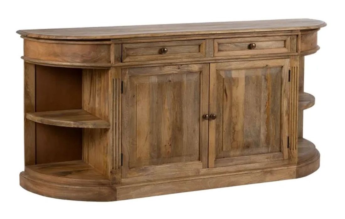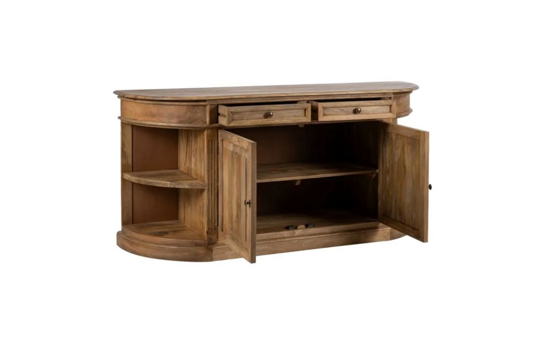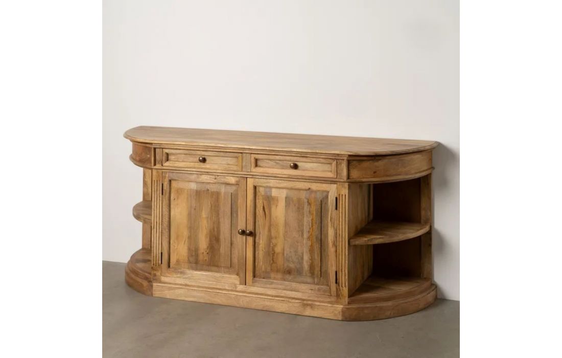 Aparador com design rústico em madeira de mango, com acabamento natural que destaca os veios únicos e contém duas gavetas e duas portasDestinatário :