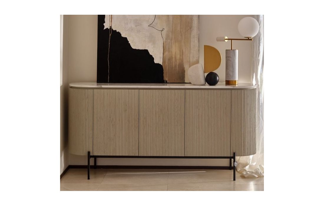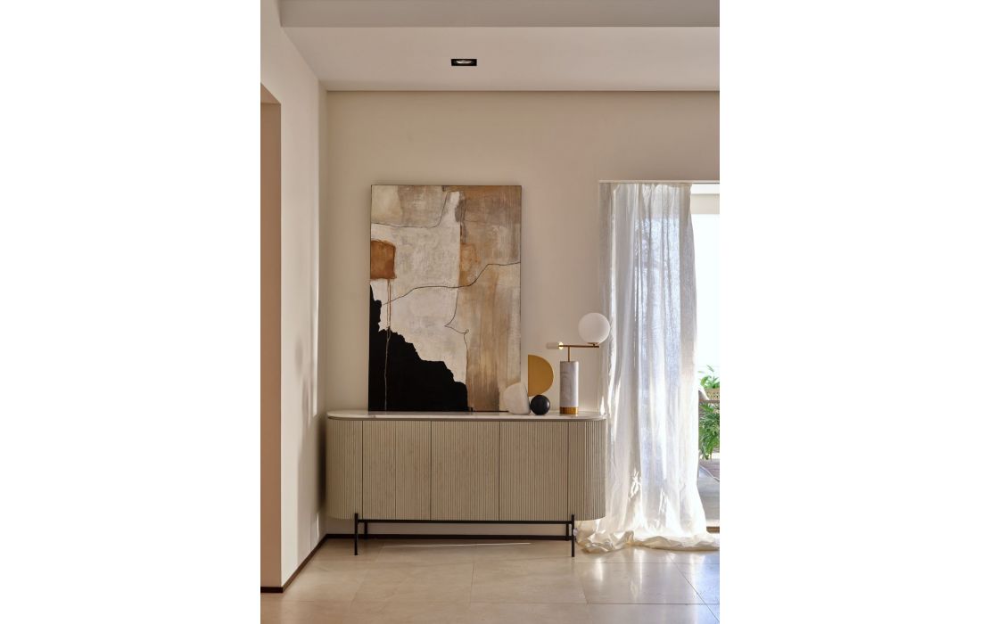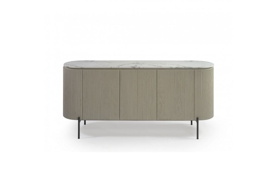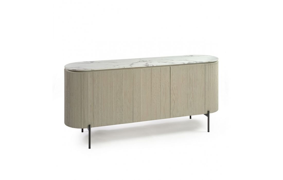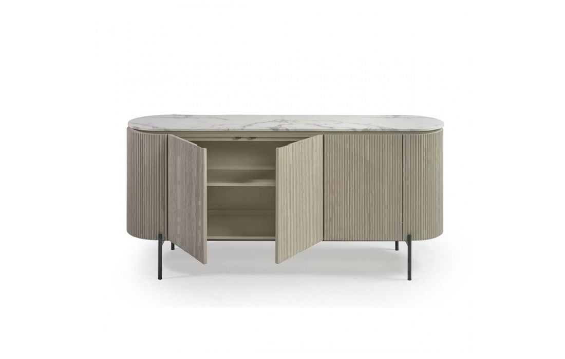 O APARADOR RICKY em madeira de carvalho. Envoltório de pedra e pés de metal. É uma peça com um toque retrô em combinação com retas no design de suas portas e corpo que tem um efeito de ripas de madeira. É uma peça com muita personalidade, estilo sofisticado e muita capacidade para salas de estar elegantes.Destinatário :