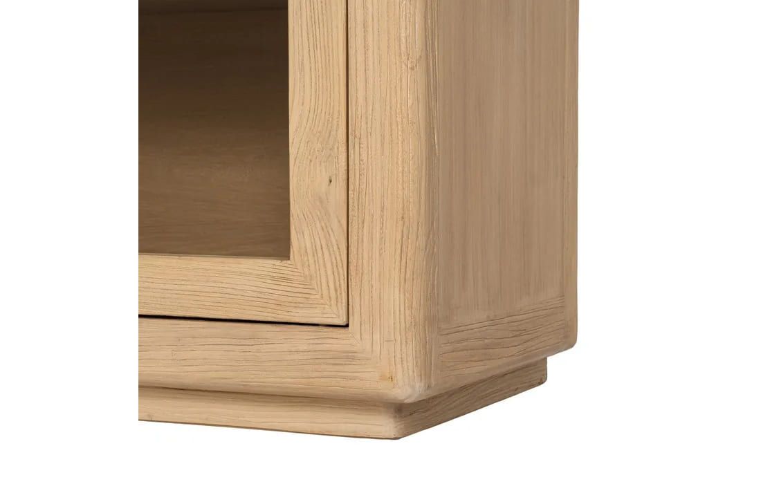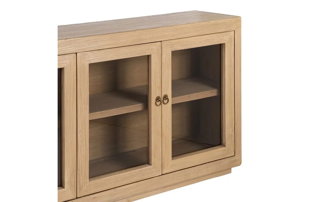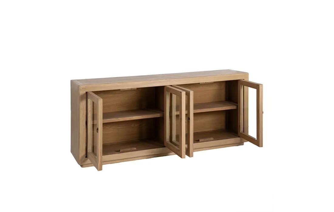 Este aparador combina a robustez da madeira de olmo com a leveza e elegância do vidro, criando uma peça equilibrada e contemporânea. Com quatro portas, oferece ampla capacidade de arrumação, permitindo organizar objetos com praticidade enquanto mantém um visual sofisticado.Destinatário :