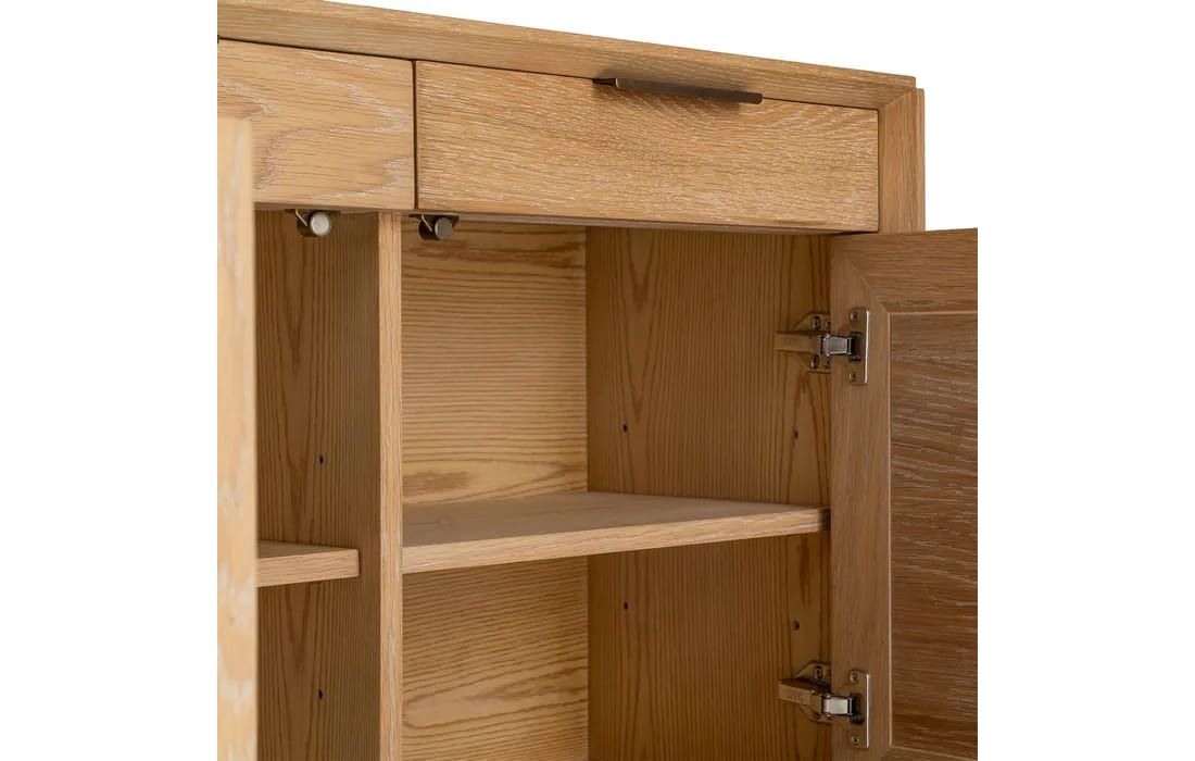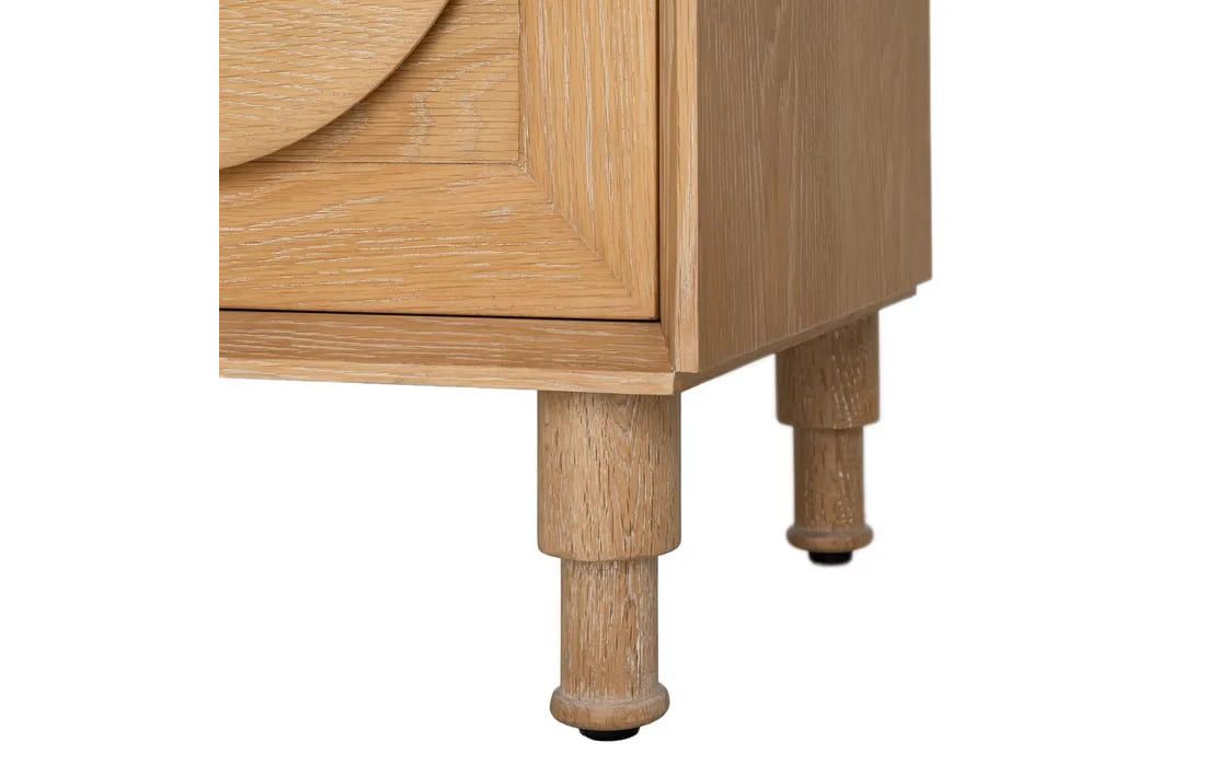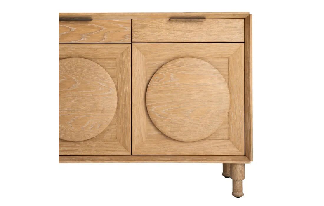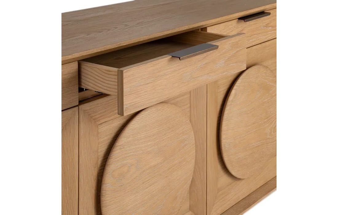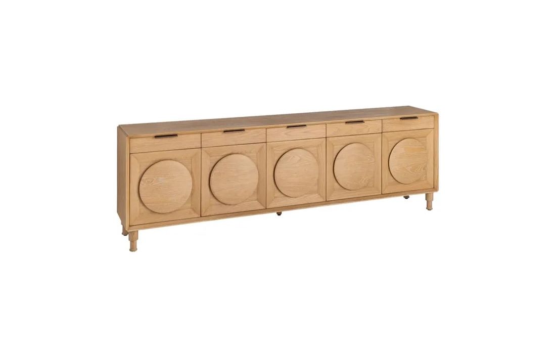Aparador em madeira de carvalho com 5 portas, destacando-se pelos detalhes circulares esculpidos em cada frente. Design elegante e moderno, com amplo espaço de arrumação. Ideal para salas de jantar ou estar que procuram sofisticação e funcionalidade.Destinatário :