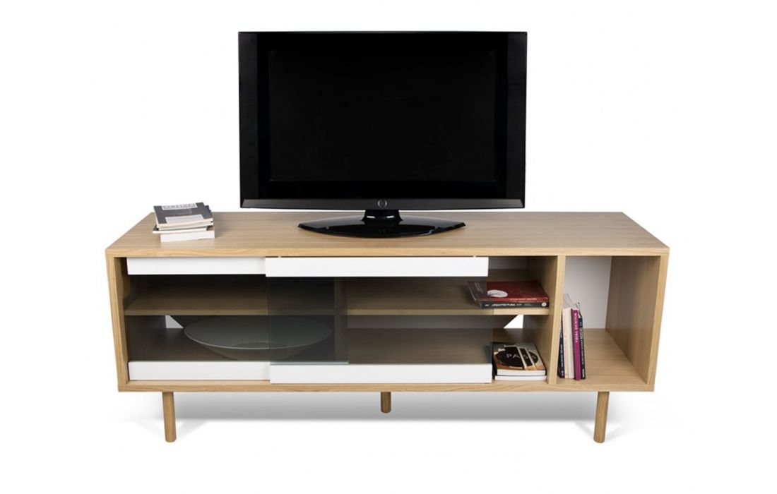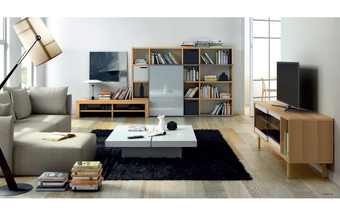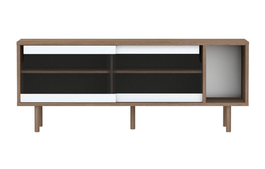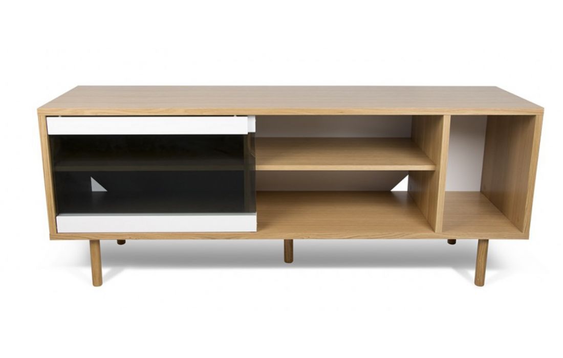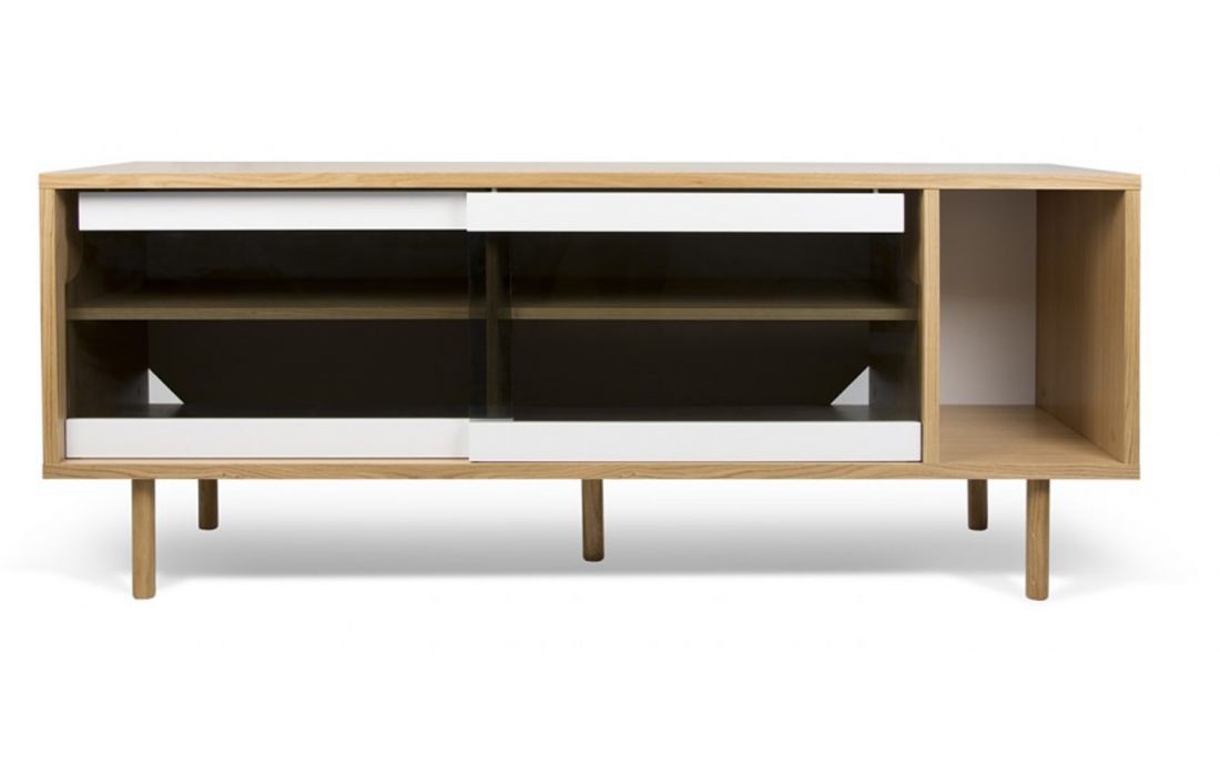 Aparador de linhas simples, composto por 3 espaços, dois com portas de correr e outro aberto. As portas de vidro possuem rasgo no topo para colocar a mão e, desta forma, facilitar a abertura.
