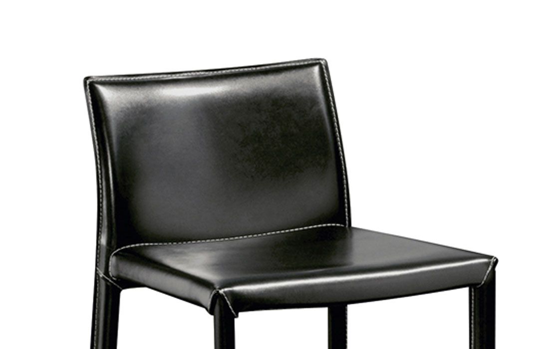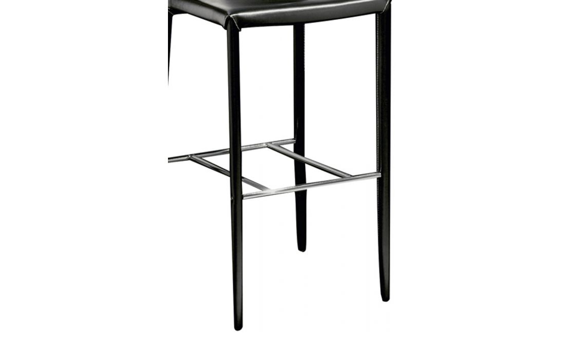 Banco bar com revestimento em couro regenerado preto, com prespontos a fazer contraste e pés com pormenor em metal