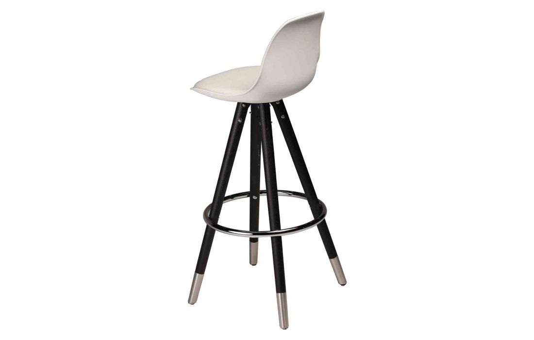 Banco bar com estrutura em plastico branco com pés em preto e tampas de metal