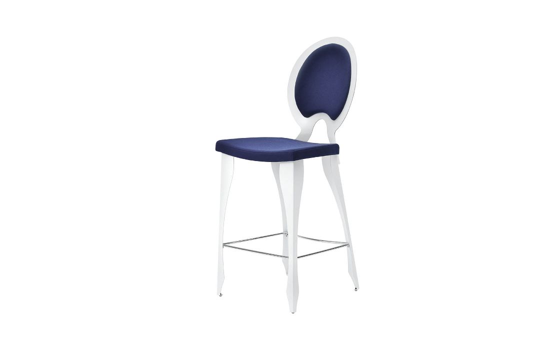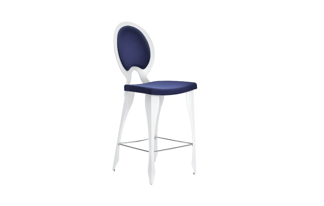 Banco bar com costas e assento revestido em tecido, ecopele sintética ou pele genuína com estrutura cromada ou em aço branco