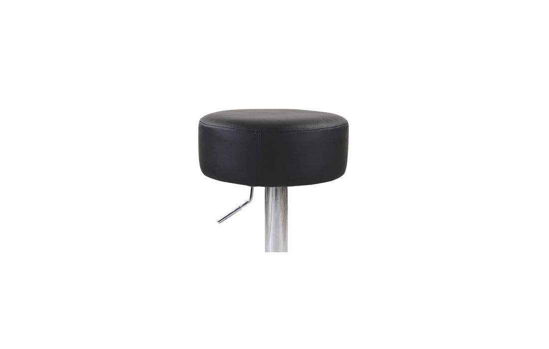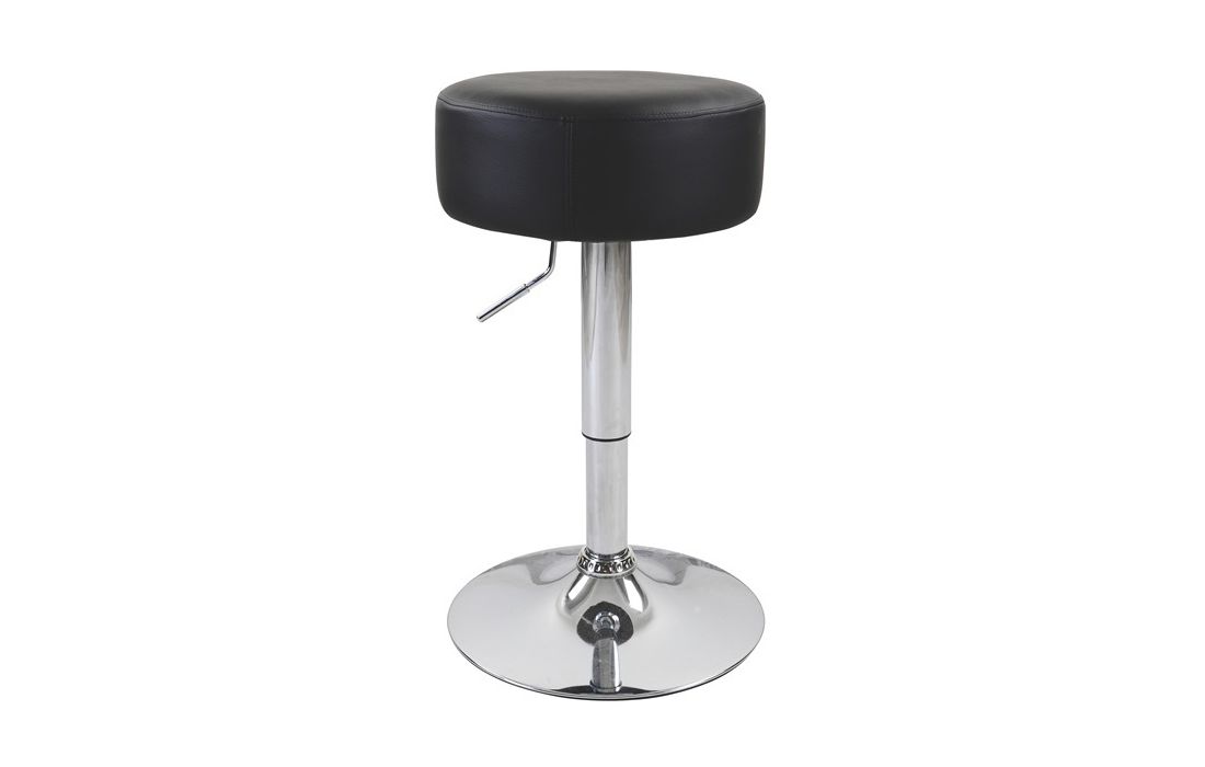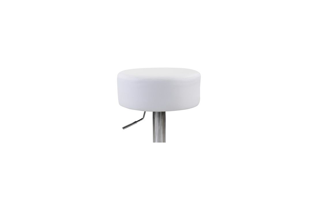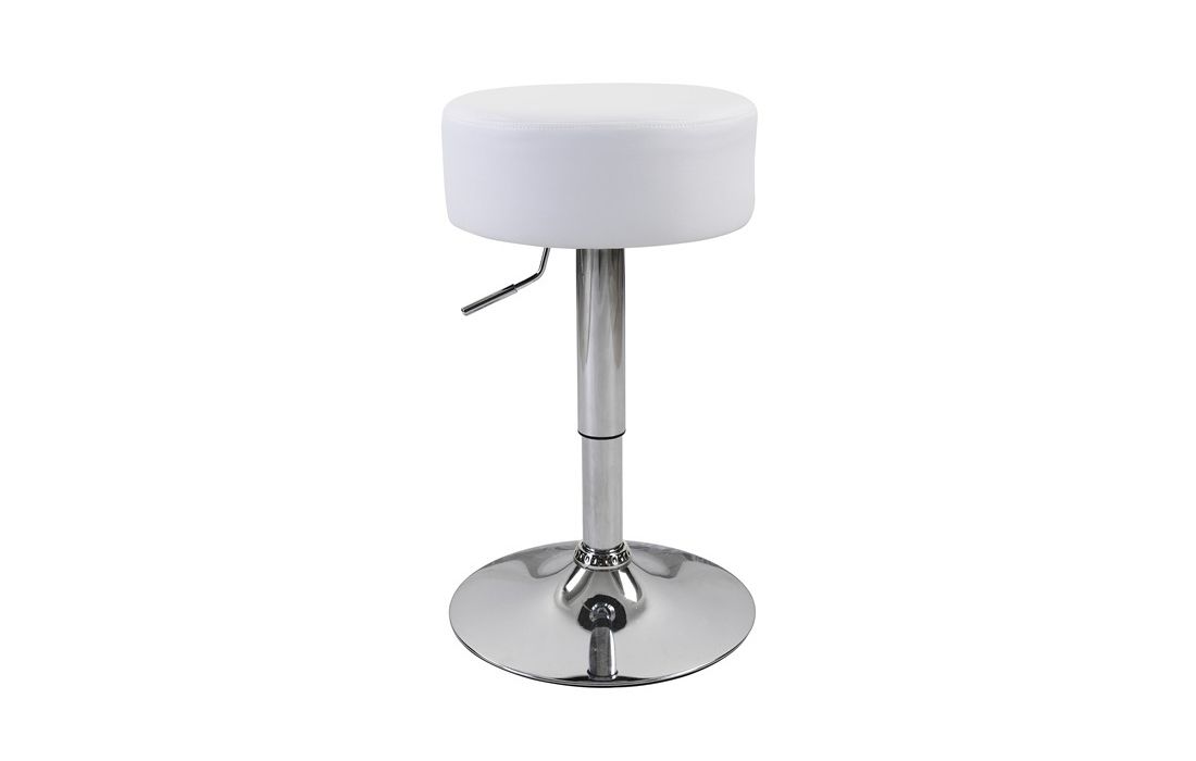 Banco bar giratório com estrutura em aço cromado e assento em pele sintética de cor branco ou preto.
