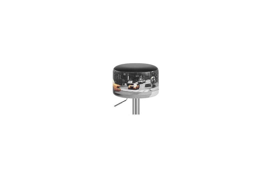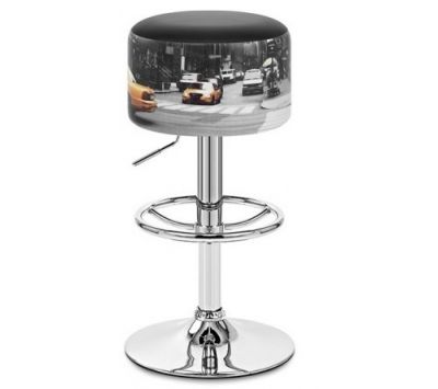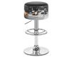 Banco bar com estrutura em aço cromado, assento em pele sintética preta com decoraçao.