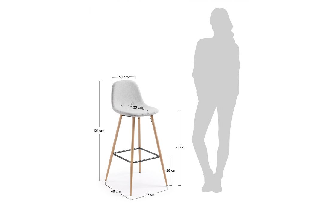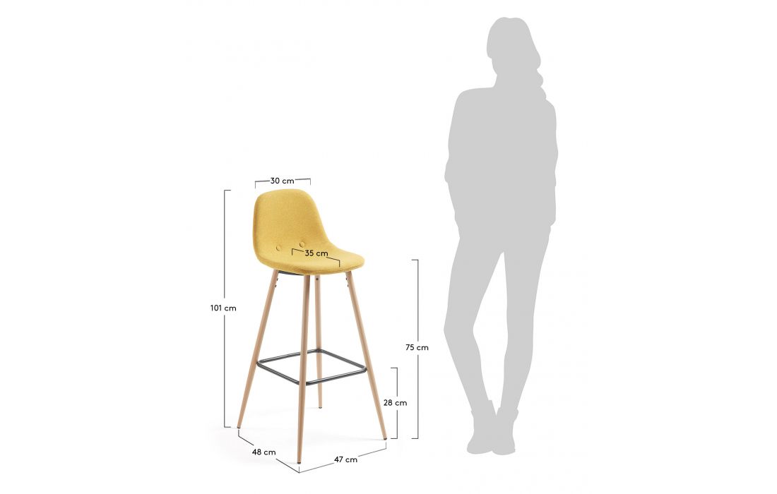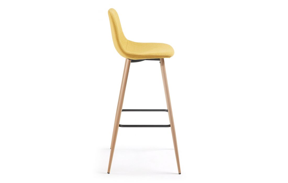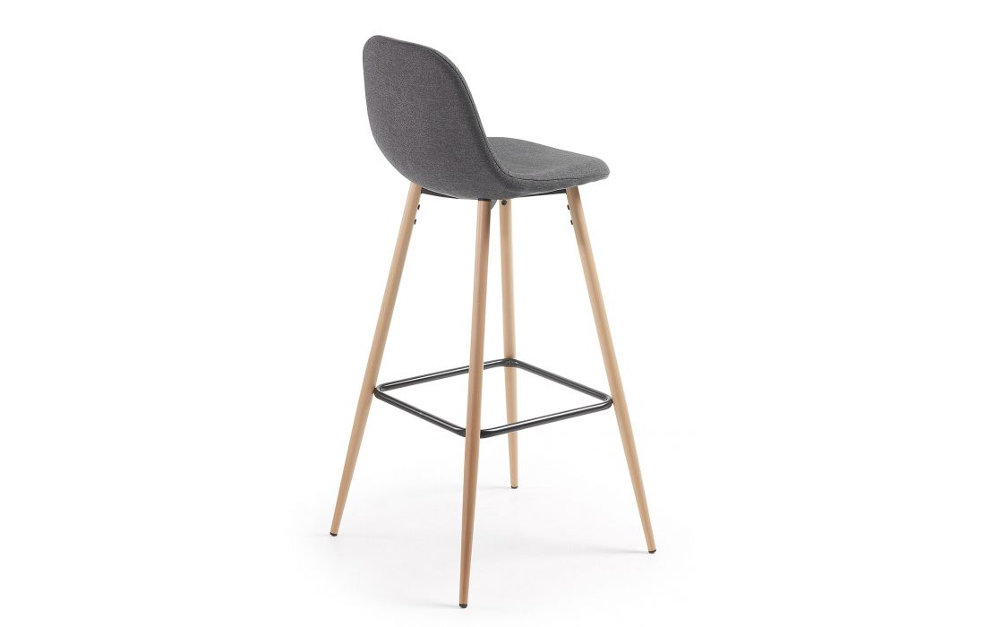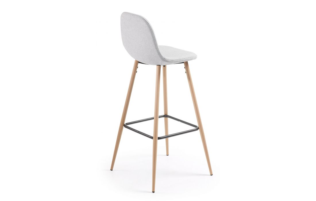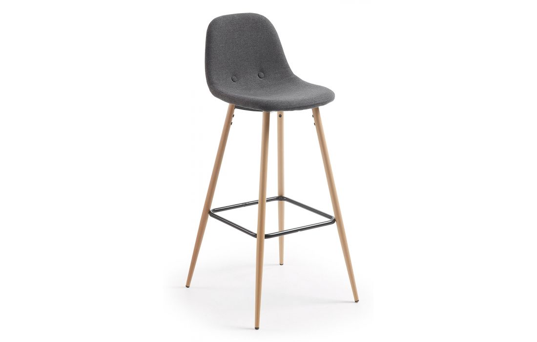 Banco bar com estrutura em metal a cor de madeira de faia , assento e costa em tecido de cor cinza claro, cinza escuro ou mostarda.