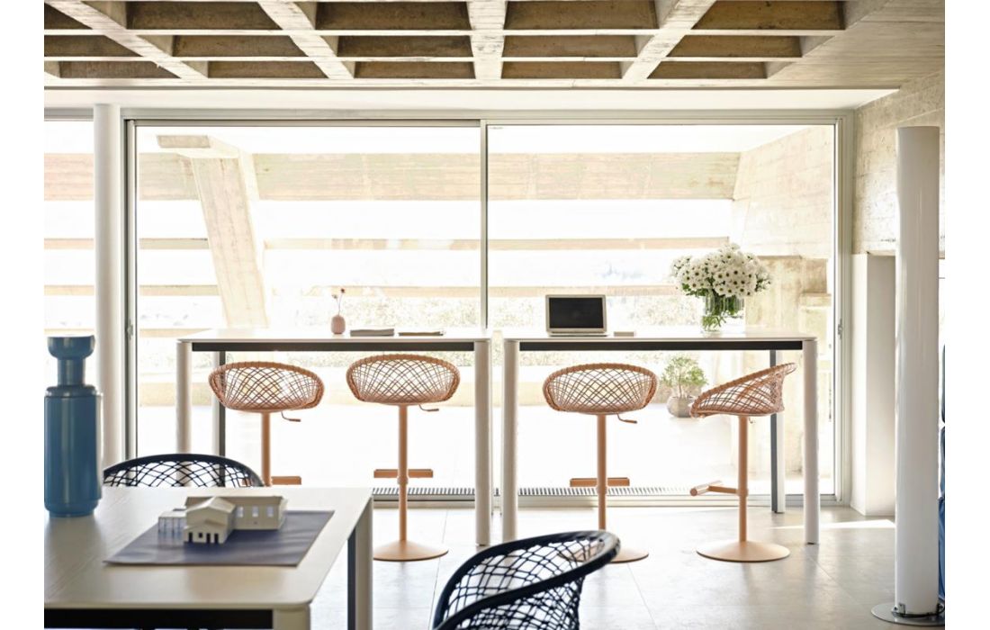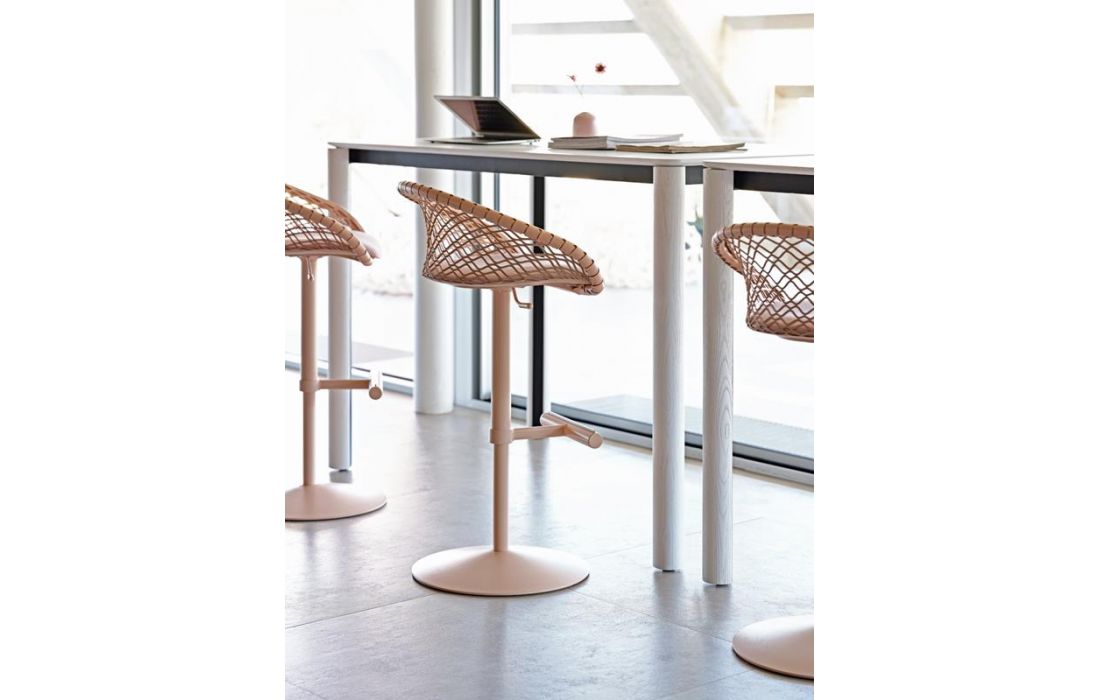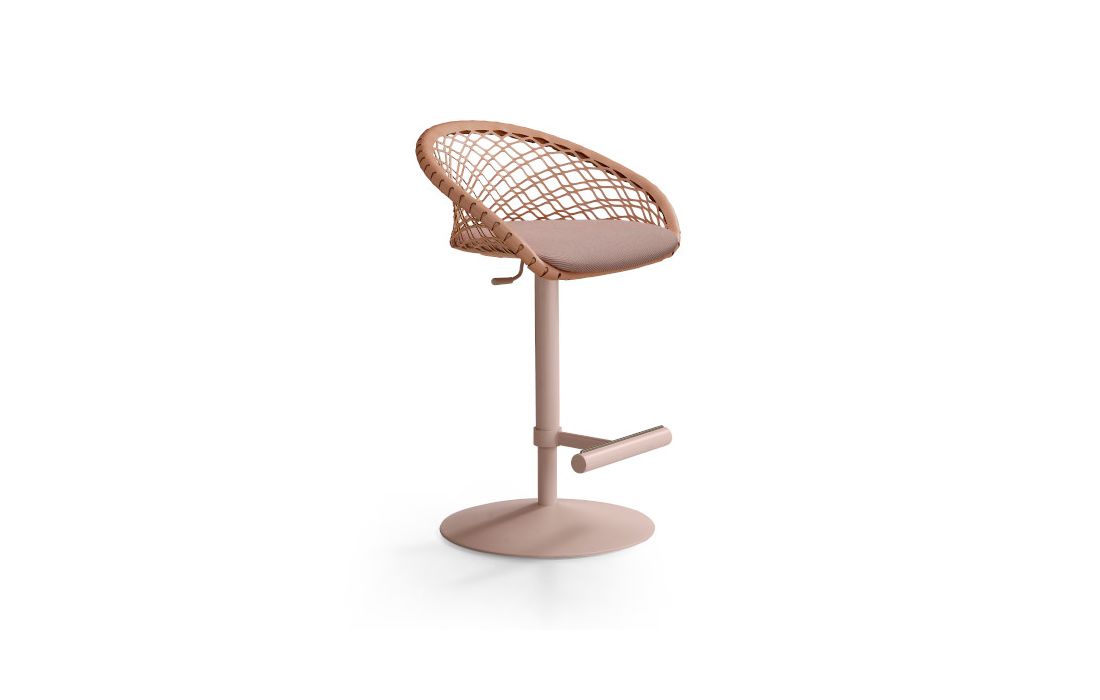Banco bar ajustavél em altura com estrutura em metal, encosto em pele e assento estofado a tecido.Destinatário :