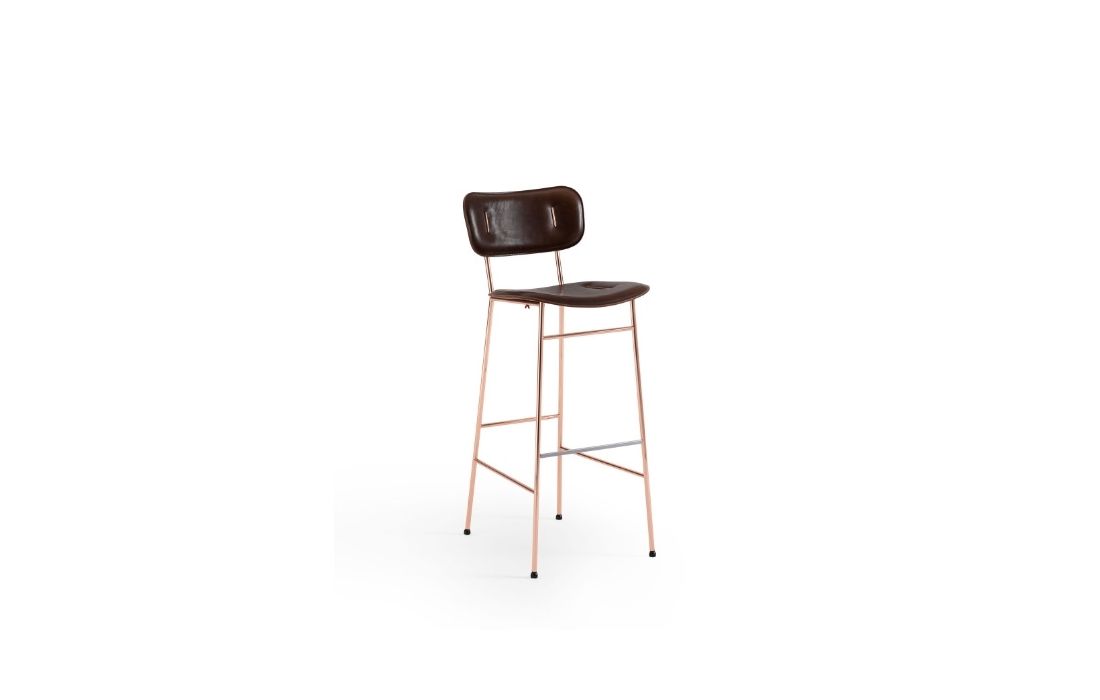 Banco bar com base metálica de quatro pés. Assento e encosto em couro ou tecido com inserções metálicas visíveis combinando com a estrutura, porcas borboletas em metal preto.Destinatário :