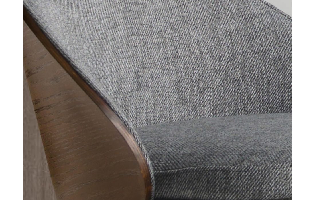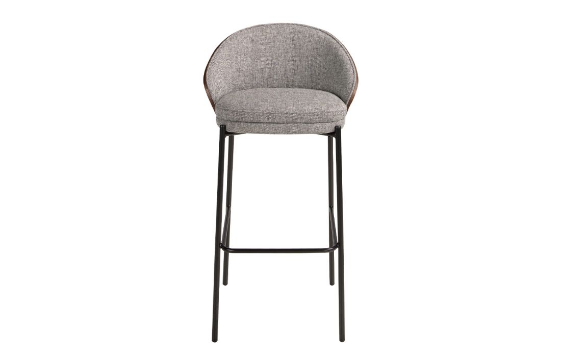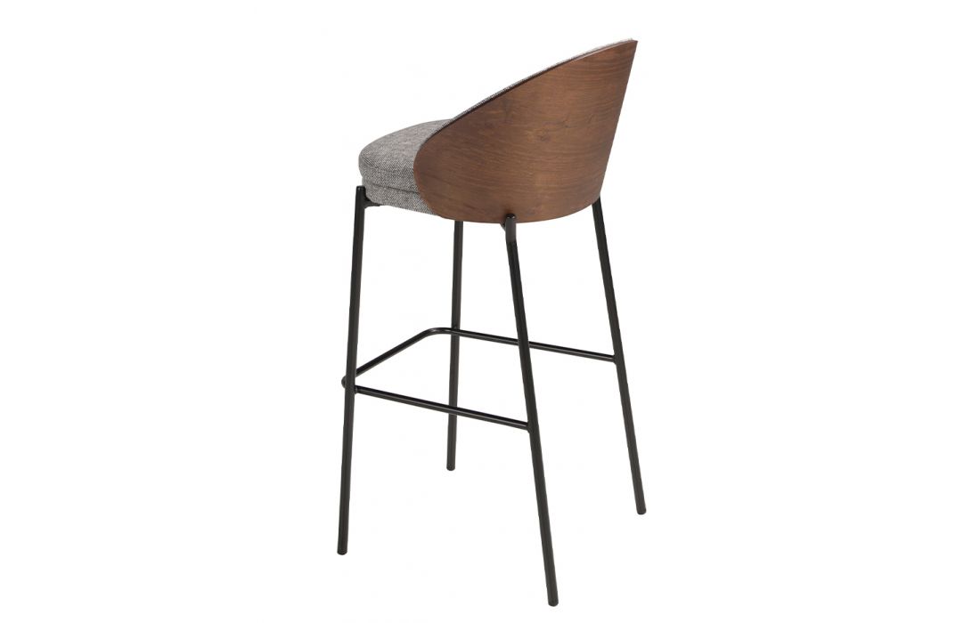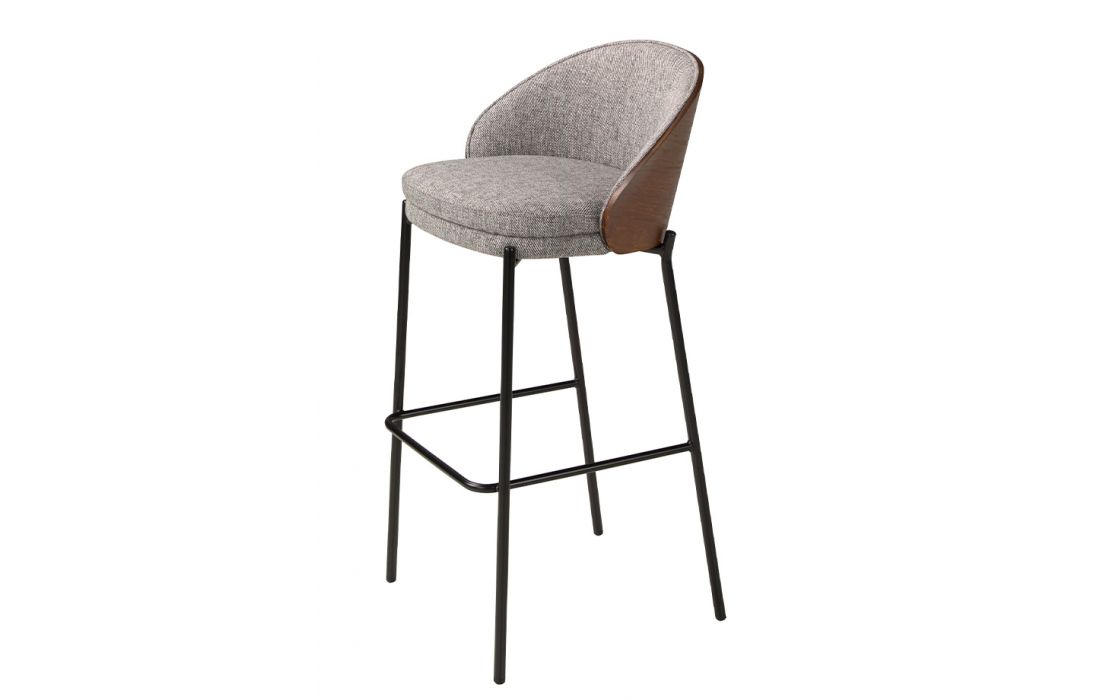 Banco bar estofado em tecido cinza e encosto em madeira folheada a nogueira natural com estrutura de pernas em aço inoxidável preto Prazo de Entrega 10 a 20 dias
