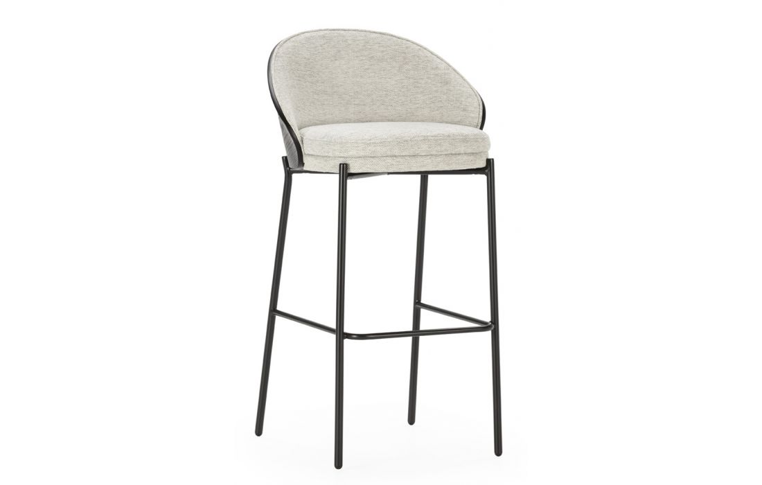Banco bar com estrutura em metal preto, assento e costa em contraplacado de carvalho cor preta e tecido cinza