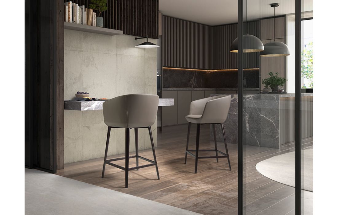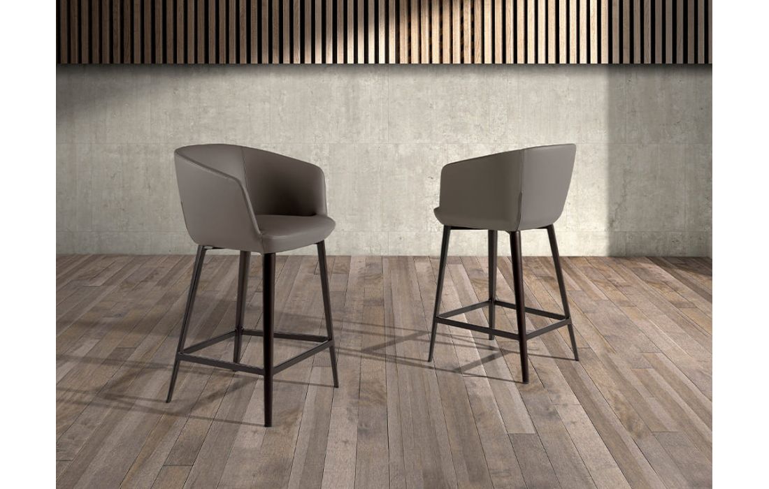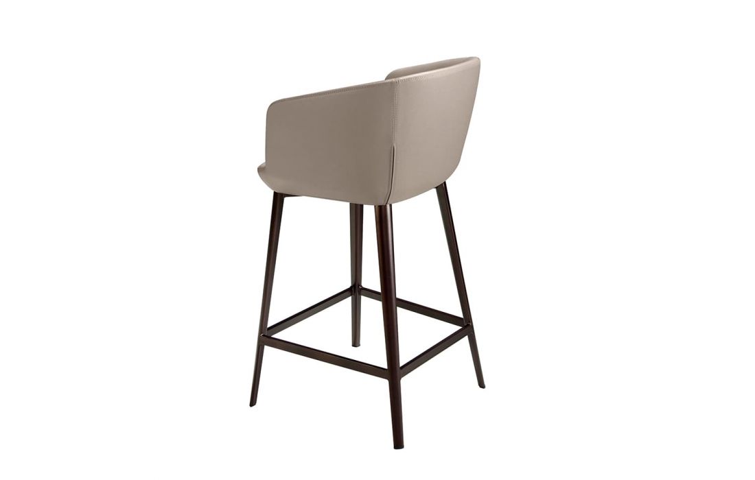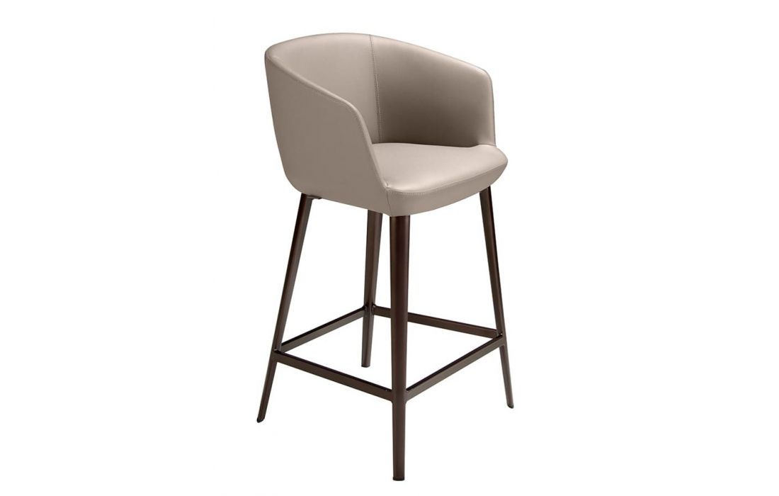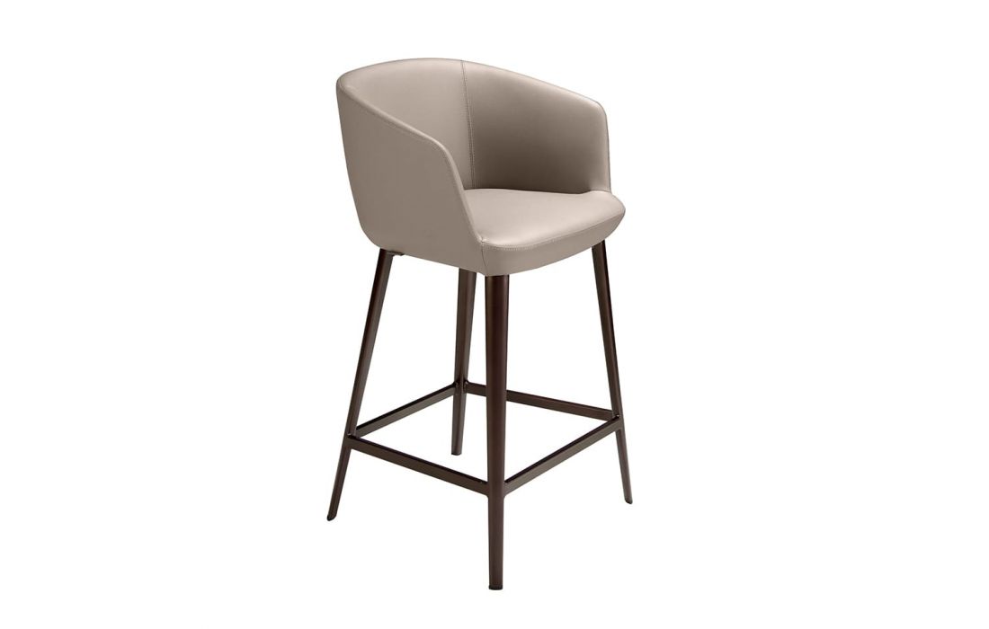Banco de design moderno com braços, assento e encosto estofados em couro sintético cinza, pés em aço inoxidável de metal castanho.Destinatário :