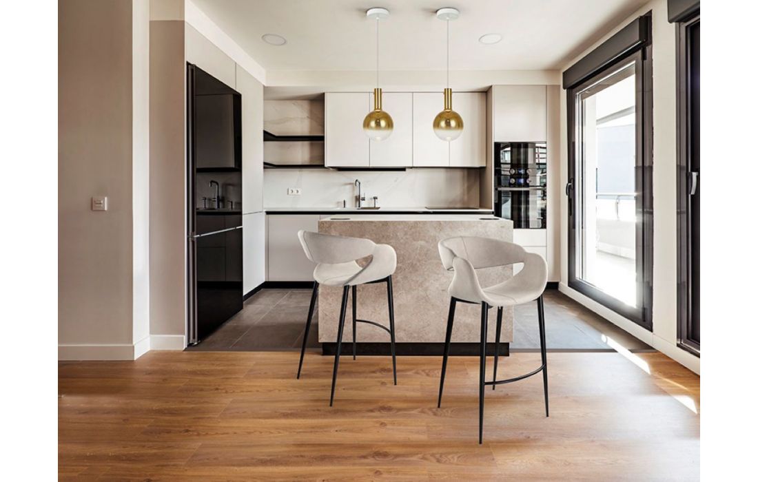 Banco de bar estofado em tecido com pesponto decorativo, pés metálicos em acabamento preto mate com apoio para os pésDestinatário :