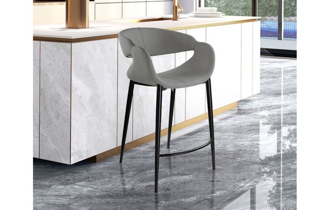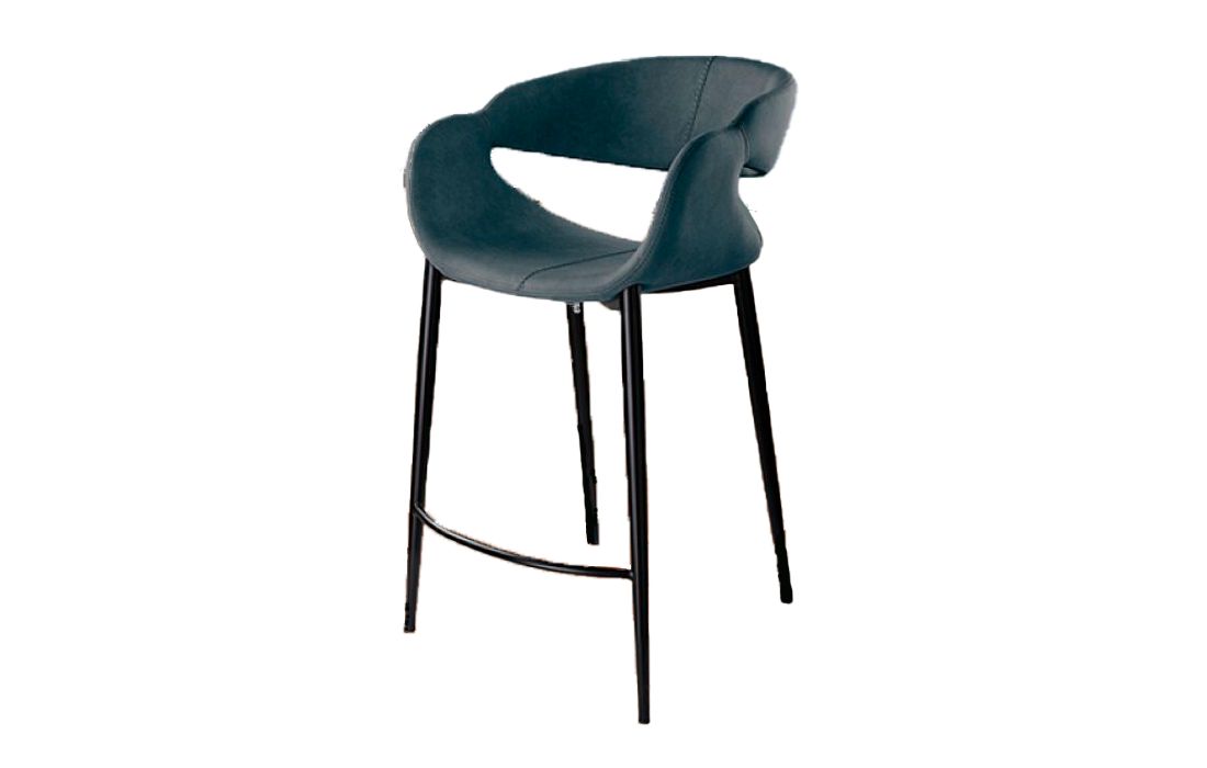 Banco de bar estofado em tecido com pesponto decorativo, pés metálicos em acabamento preto mate com apoio para os pésDestinatário :