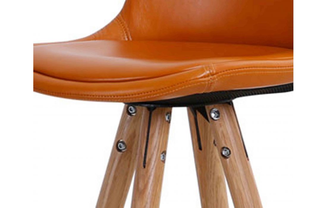 Banco Bar em madeira maciça de carvalho com estofo em pele genuína laranja e pés com pormenor de metal