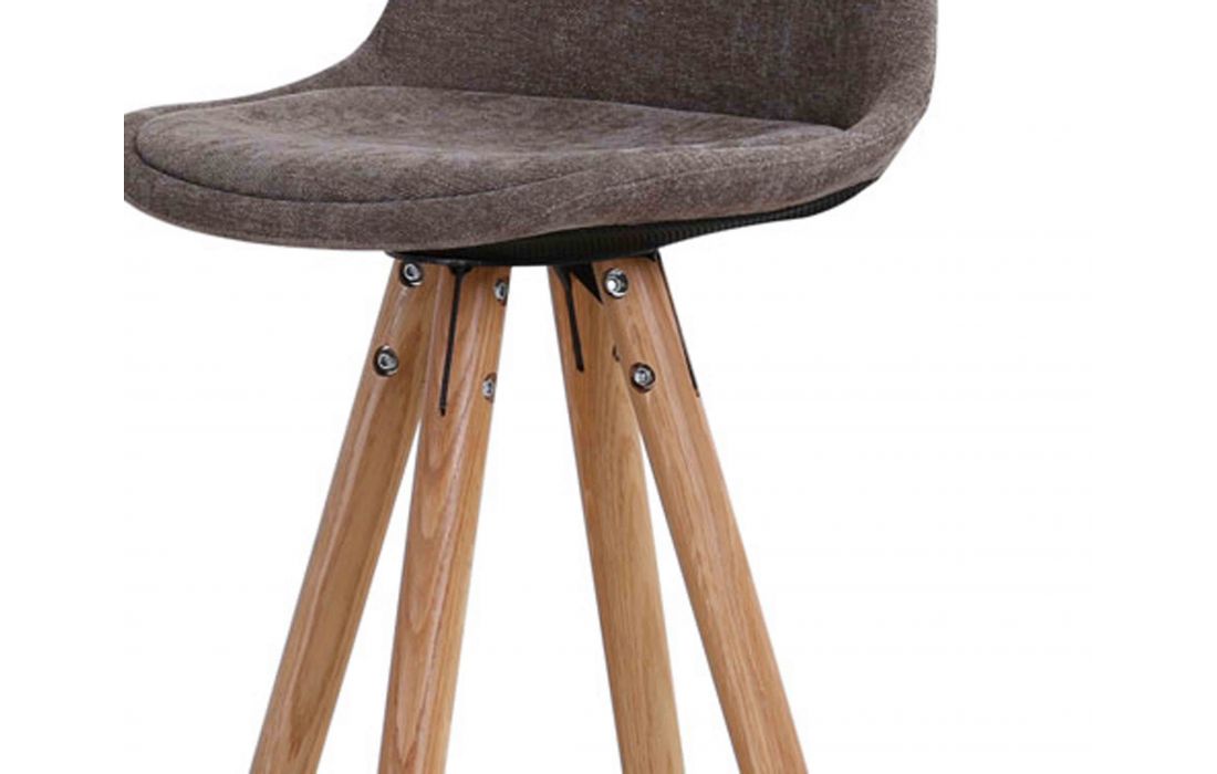 Banco Bar em madeira maciça de carvalho com estofo em tecido cinza e pés com pormenor de metal