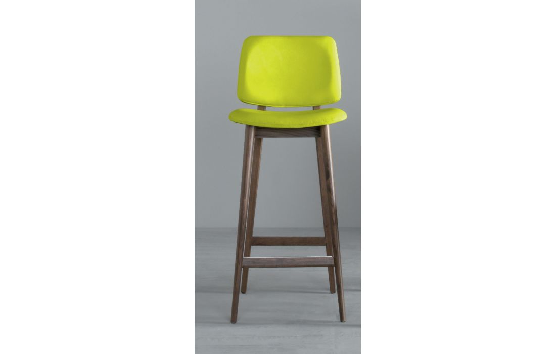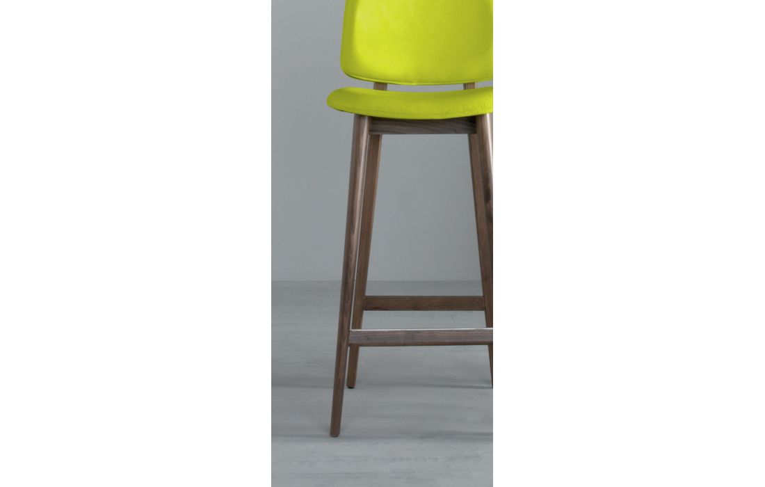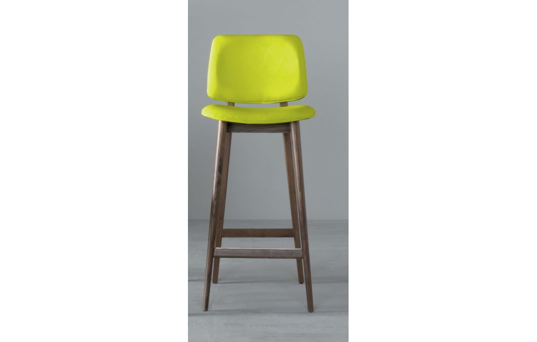 Banco Bar com estrutura em nogueira, carvalho ou carvalho queimado com assento e encosto revestido em pele sintética, tecido ou pele genuína