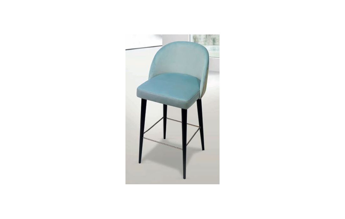 Banco bar estofado, pousa pés de metal com pés em madeira maciça de freixo nos vários acabamentos e revestimentos possiveis.