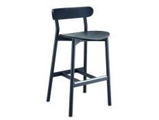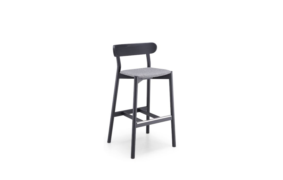 Banco bar feito em madeira, opção de assento com estofo em tecido.